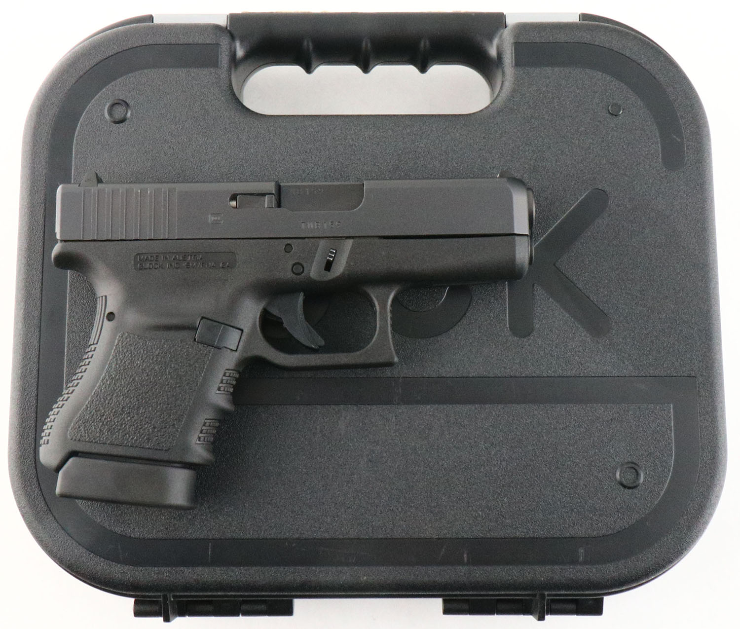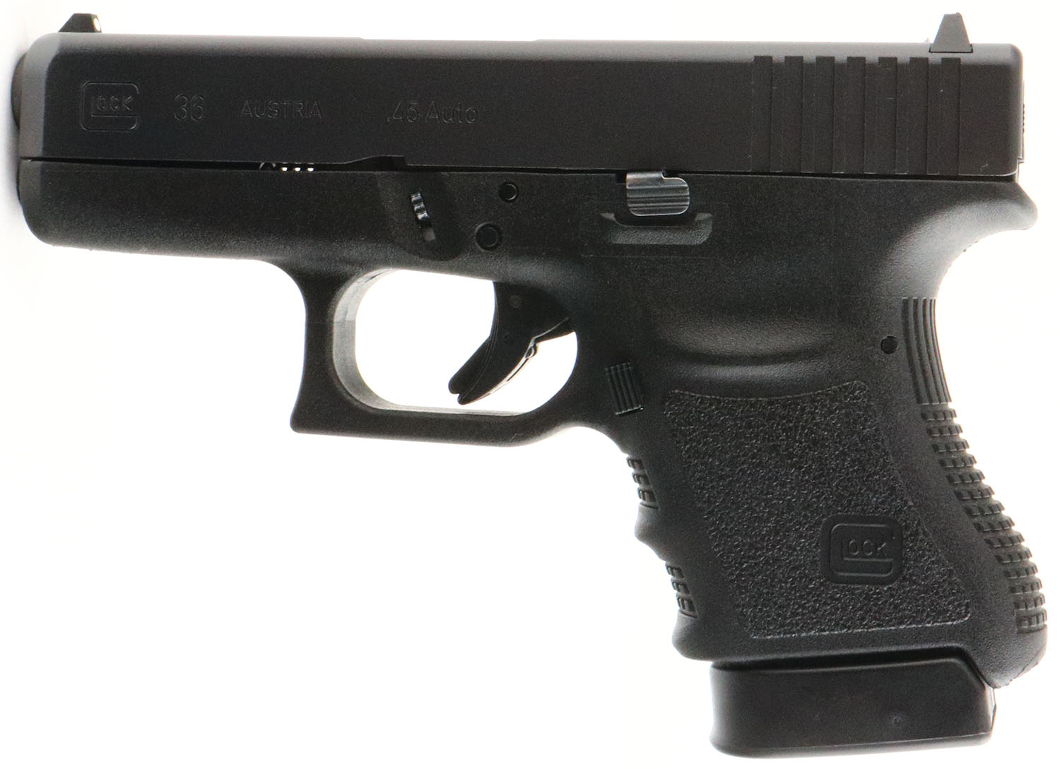 CASED, Glock, Model 36 Gen 3, CAL: 45 ACP, MFG: Modern, SN: TNB159, Semi Auto Pistol, 3 3/4'' barrel. The synthetic & checkered polymer grip frame is excellent. The matte black finish on the slide rates 99%+. Bore is excellent. Factory contrast sights. Comes in SN match hard case, with extra mag, speed loader, related paperwork & cleaning rod/brushes. FFL Req. - Value: 400 to 550