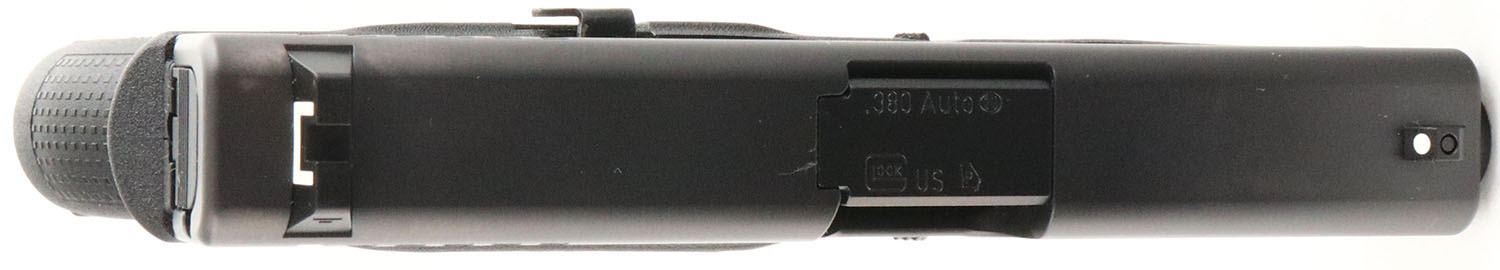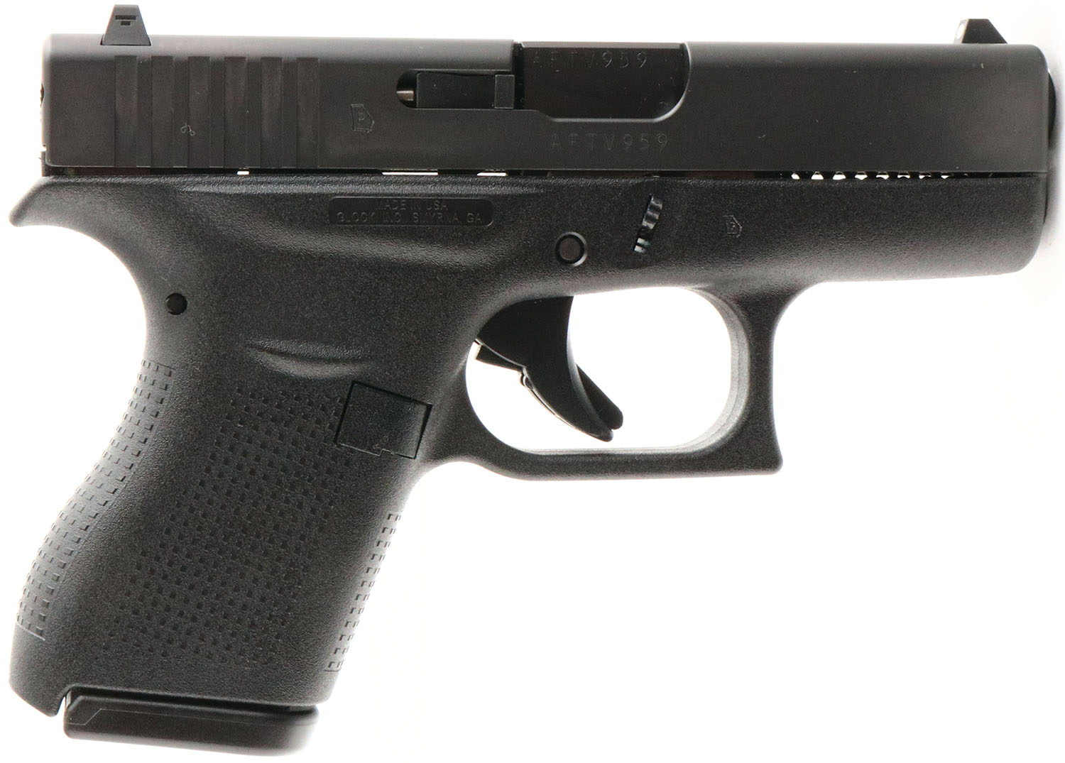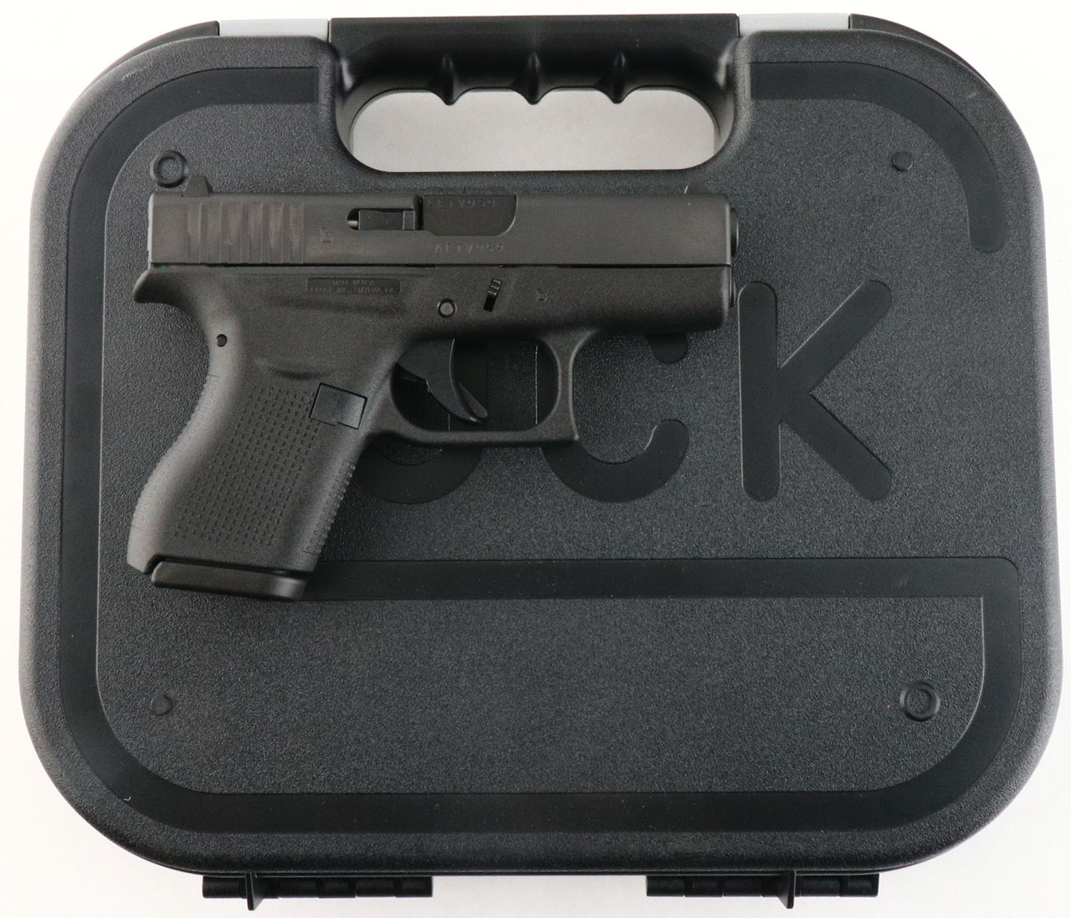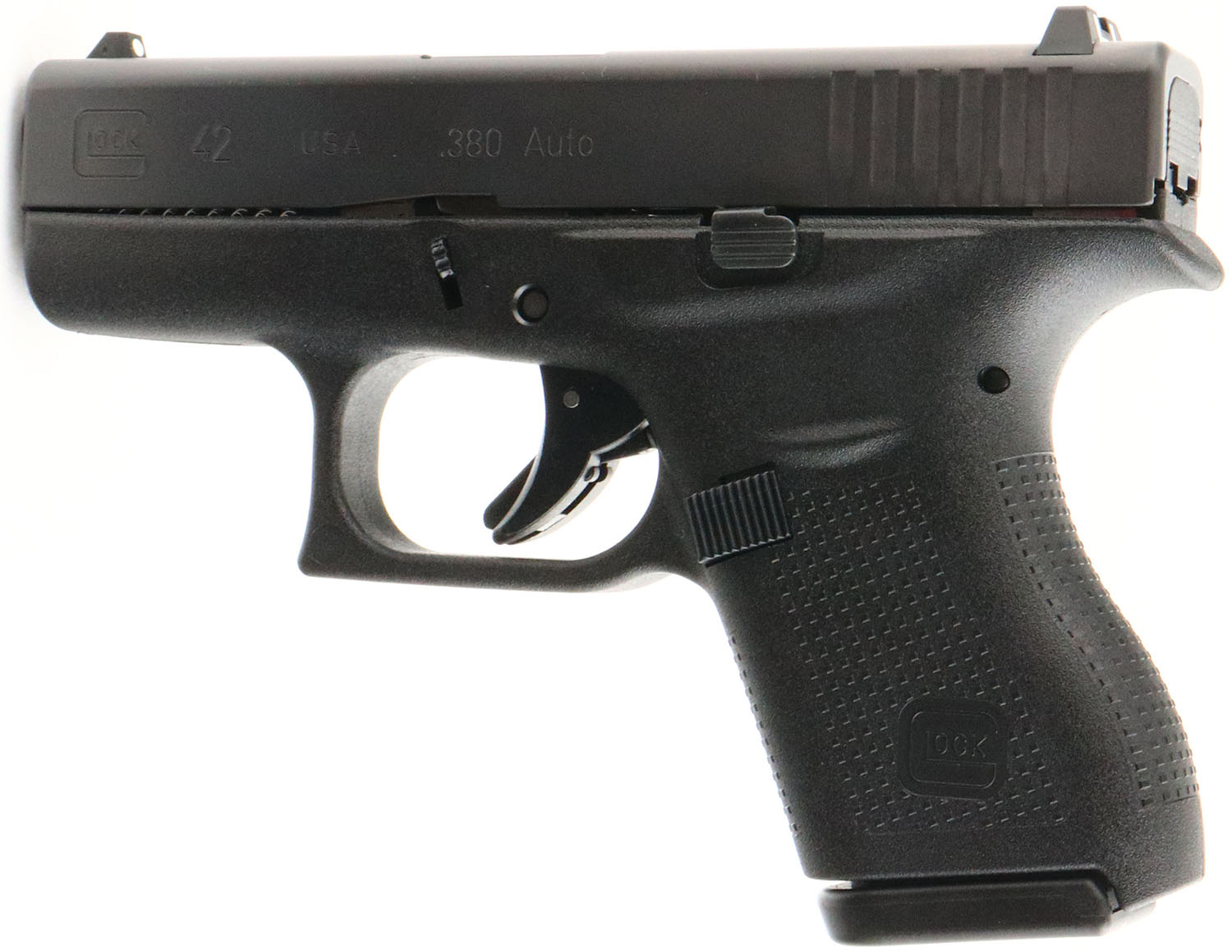 NEW CASED, Glock, Model 42 Gen 5, CAL: 380 Auto, MFG: Modern, SN: AFTV959, Semi Auto Pistol, 3'' barrel. The textured polymer grip & frame are mint. The factory matte black finish is mint. Bore is mint. Factory rear U night sight & front dot night sight. Comes in factory hard case, with owners manual, lock/key, cleaning rod & brush, (2) 6rd mags & speed loader. NOS. FFL Req. - Value: 350 to 550