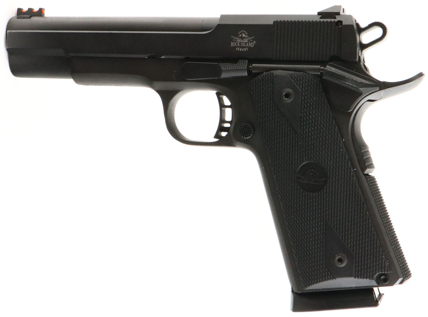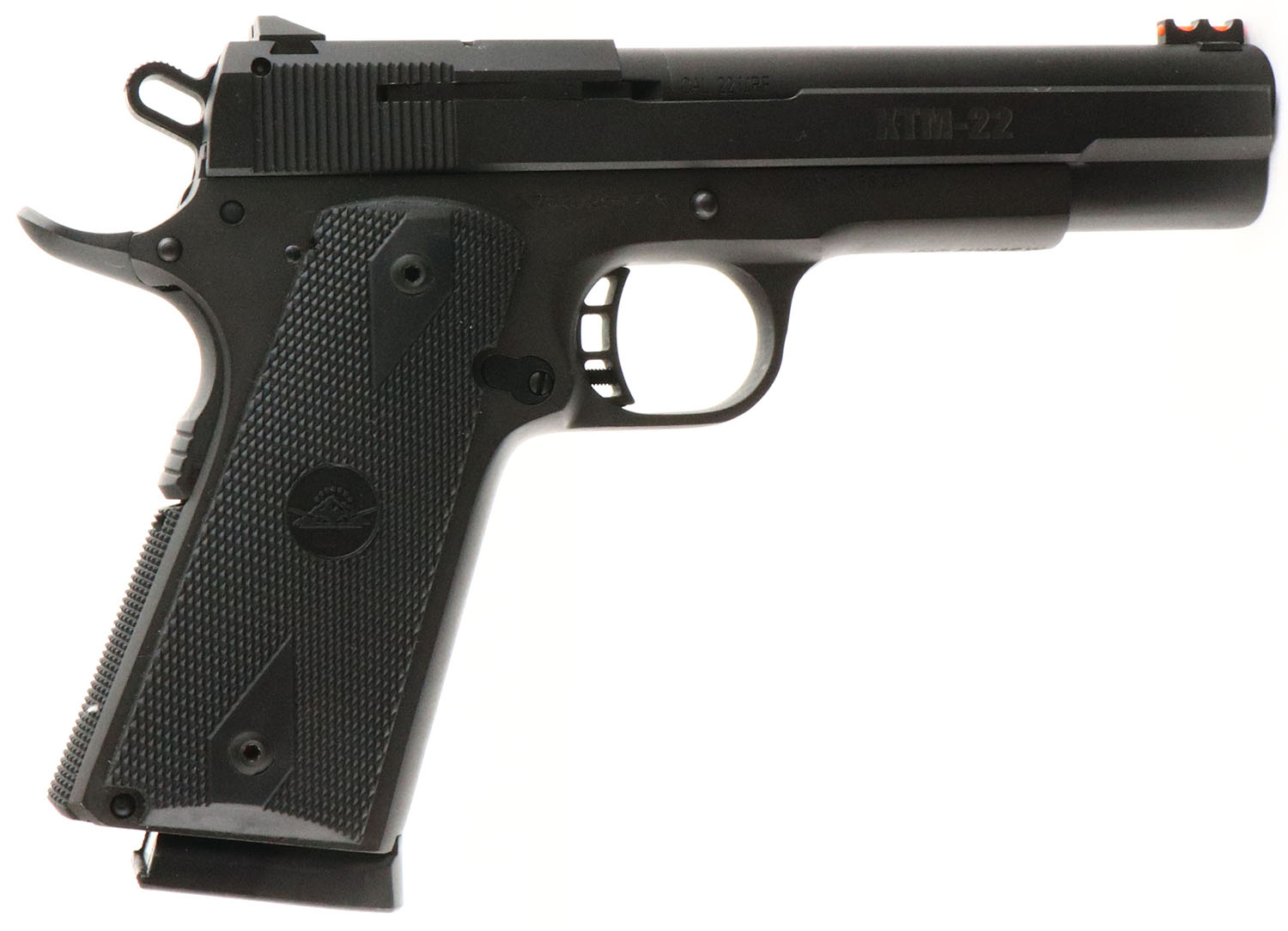 Rock Island Armory, XTM-22, CAL: 22 MRF, MFG: Modern, SN: XTM025476, Semi Auto Pistol, 4 1/2'' barrel. The original checkered hard rubber grips are excellent. The matte black parkerized finish on the frame & slide is excellent, with minor handling marks. Bore is very good, with roughness. Factory square notch rear sight & orange fiber optic rail front sight. Factory mag. FFL Req. - Value: 350 to 500