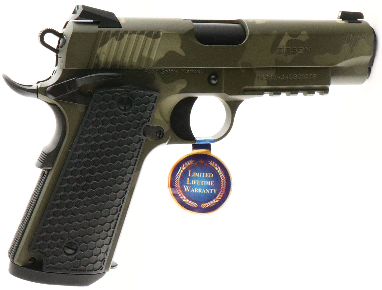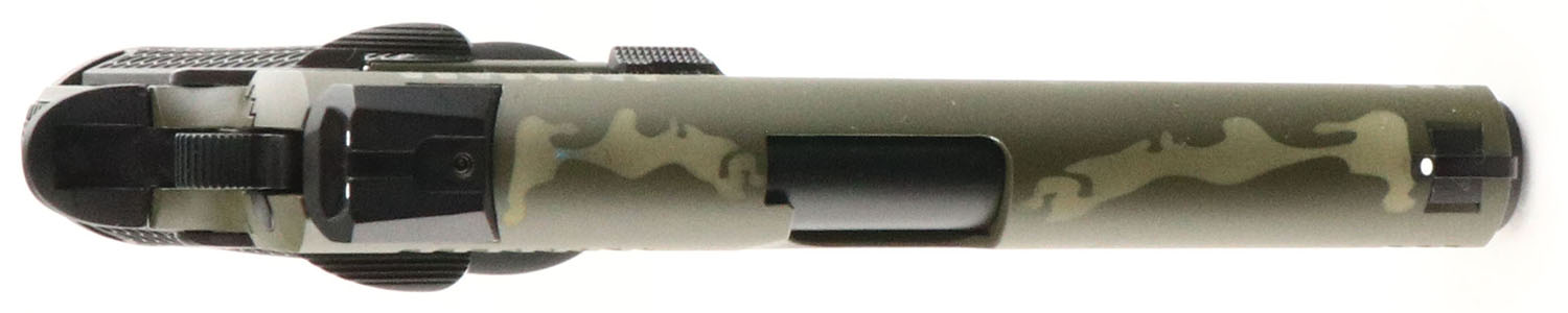 Girsan, MC 1911 C Untouchable, CAL: 9mm, MFG: Modern, SN: T6368-24CG00209, Semi Auto Pistol, 4 1/4'' barrel. The original honeycomb textured grips are excellent. The camo finish on the frame & slide is mint. Bore is excellent. Factory contrast sights. Factory magazine. Factory hang tag attached to trigger guard. FFL Req. - Value: 350 to 450