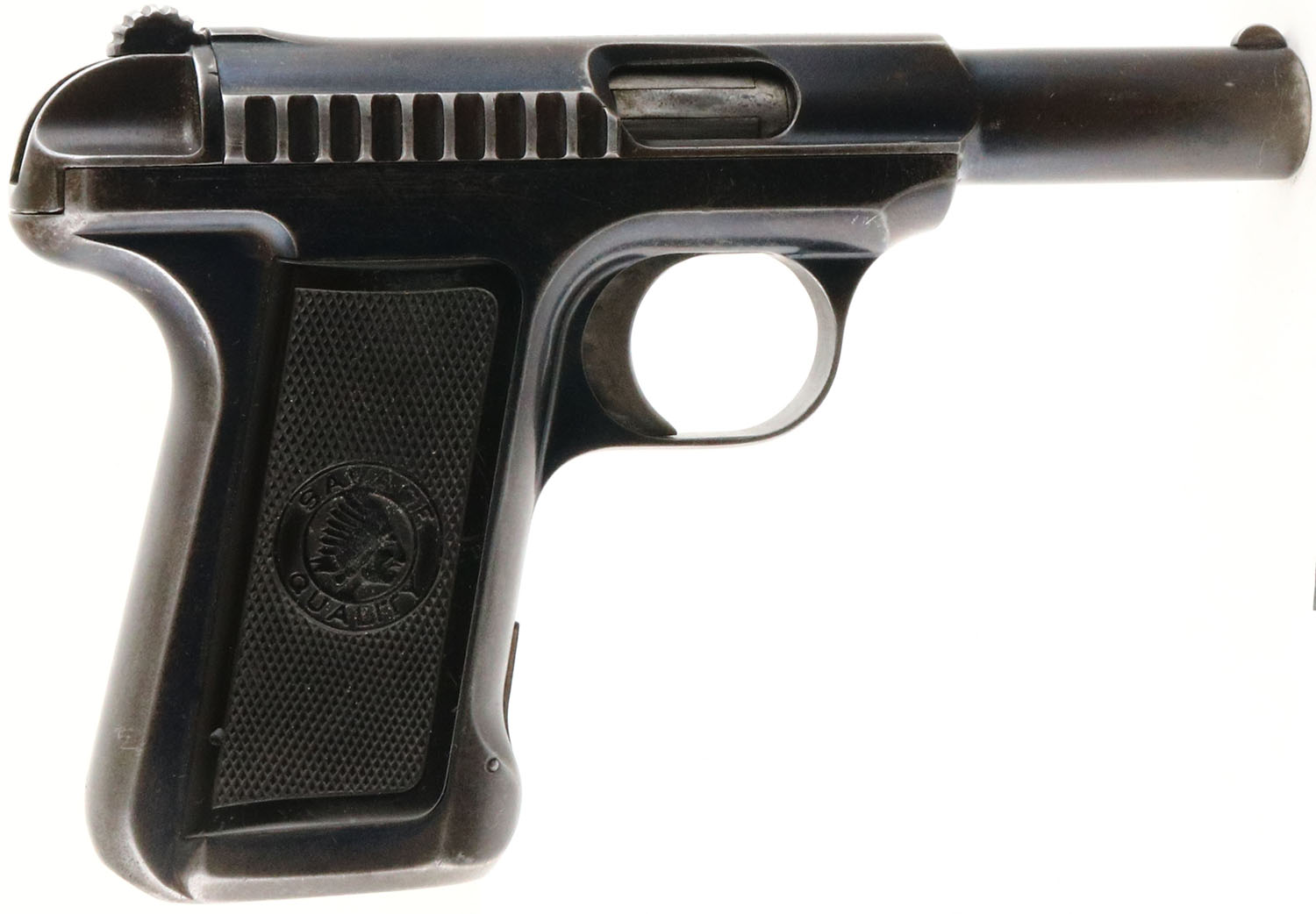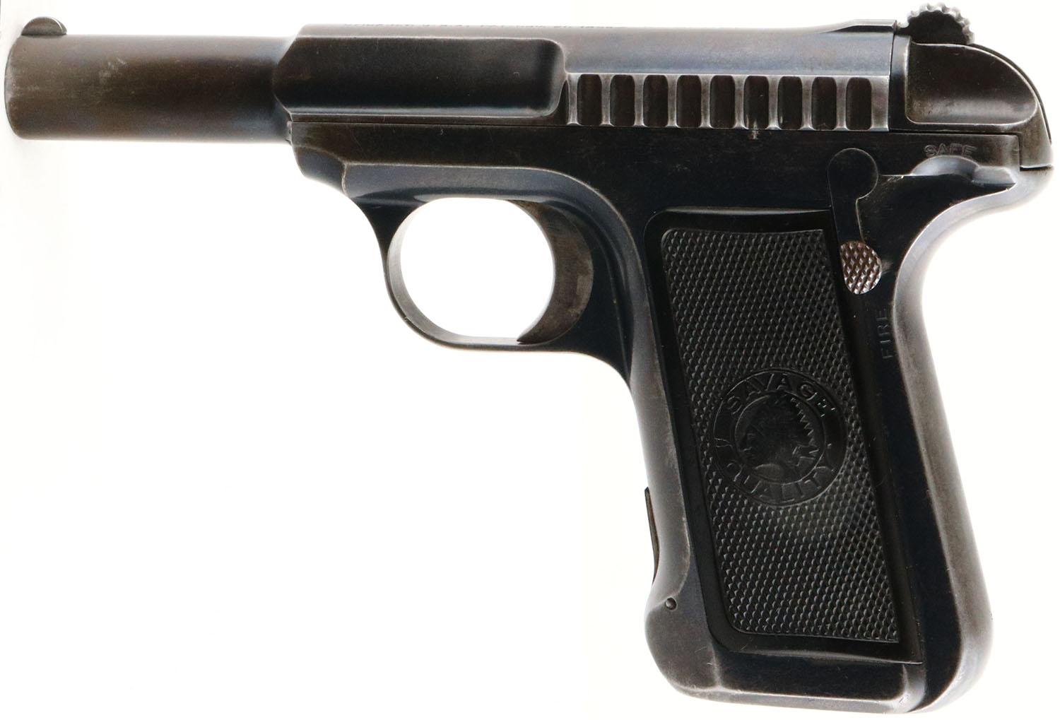 Savage, Model 1907, CAL: 32 ACP, MFG: 1907-20, SN: 81187, Semi Auto Pistol, 3 3/4'' barrel. The Savage checkered plastic grips are good & solid. There are scrapes, contusions & a small edge chip on the right grip & the grips have rubbed smooth in areas, mostly around the Savage logo & the top of the grips. The original metal blue finish on the barrel rates 30%, worn to metal gray & toned to a brown patina & the frame rates 60& , with areas worn to metal gray & thinning toned to a brown patina. Small U-notch rear sight & small blade front sight. No magazine. FFL or C&R Req. - Value: 200 to 400