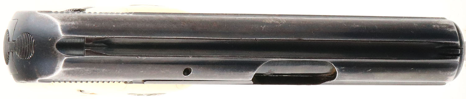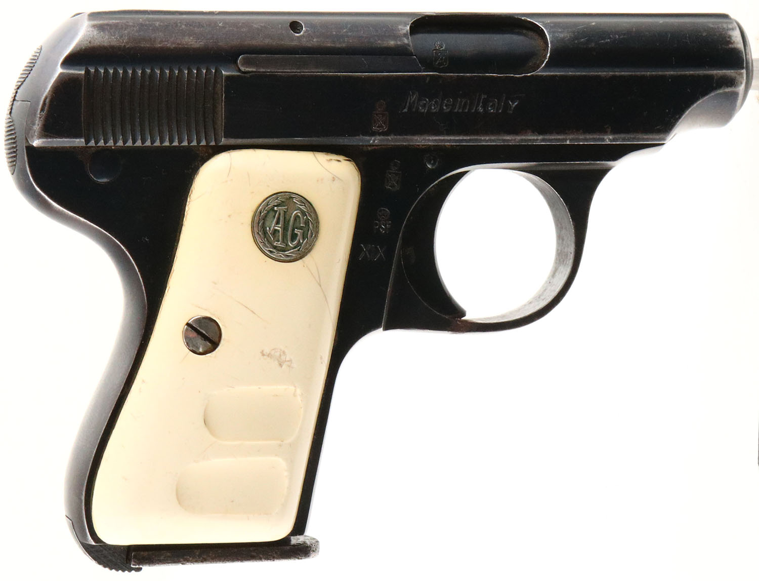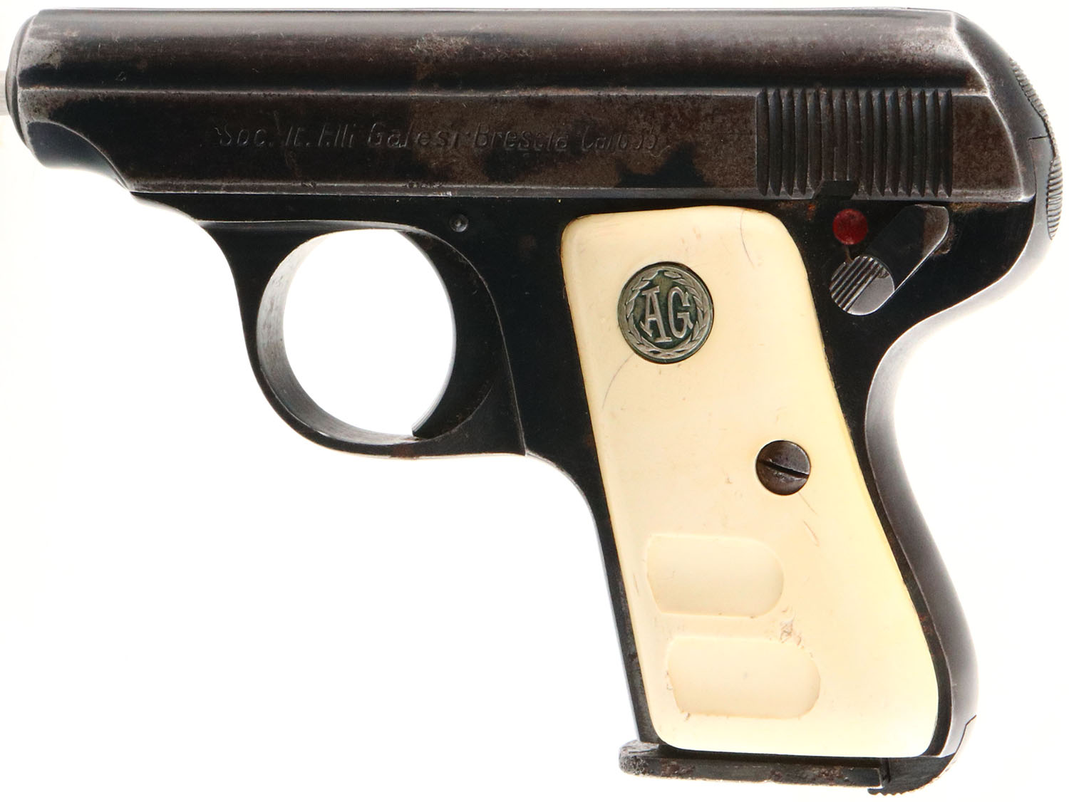 Soc. IT. F.LLI Galesi, Model 9, CAL: 25 AUTO (6.35), MFG: 1963, SN: 373072, Semi Auto Pistol, 2'' barrel. The AG faux ivory grips are good, with multiple small cracks, contusions & dings. The metal blue finish on the slide rates 60% & the frame rates 80%. Bore is excellent, with visible light wear. U-notch rear sight & small blade front sight. FFL or C&R Req. - Value: 50 to 150