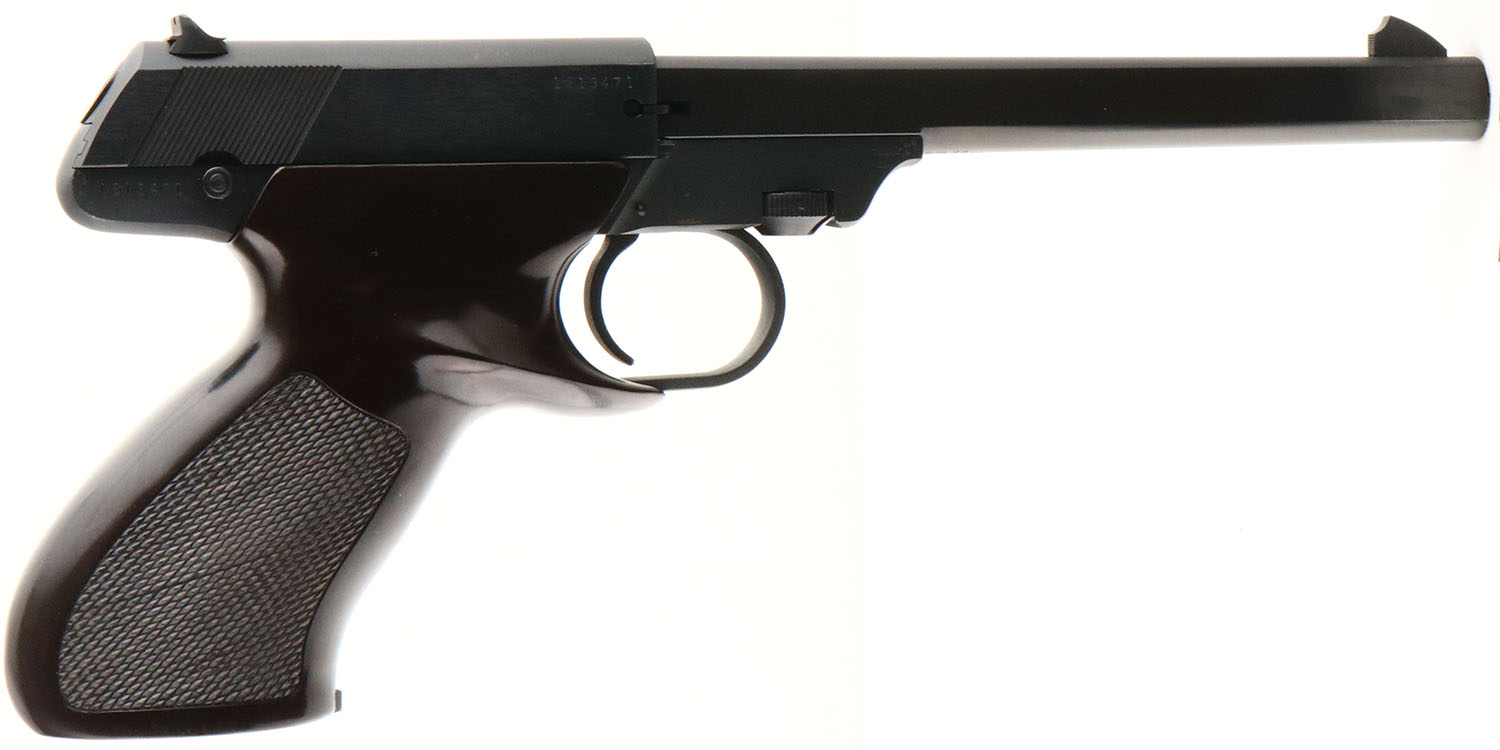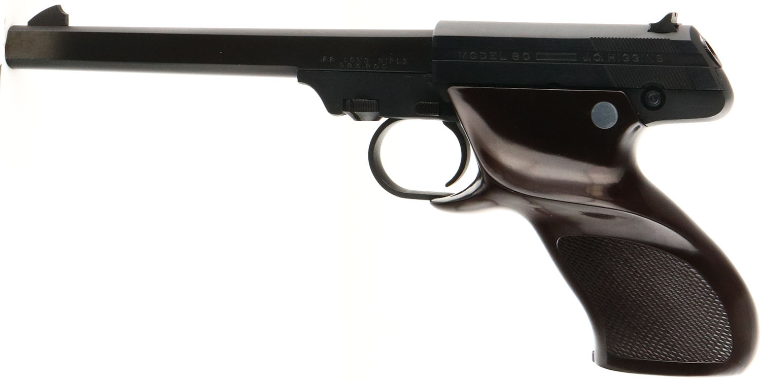 BOXED, JC Higgins, Model 80, CAL: 22LR, MFG: 1955-61, SN: 1213471, Semi Auto Pistol, 6 1/2'' barrel. The synthetic checkered target grips are excellent. The metal blue finish rates 98% overall, with an area on the right side of the barrel beginning to tone brown. Bore is excellent. Square notch rear sight & serrated blade front sight. Original magazine. Comes in factory box, with related paperwork, cleaning rod & tool. - Value: 200 to 300