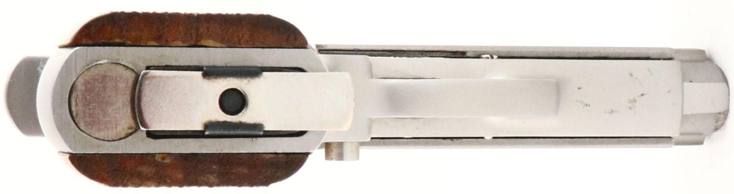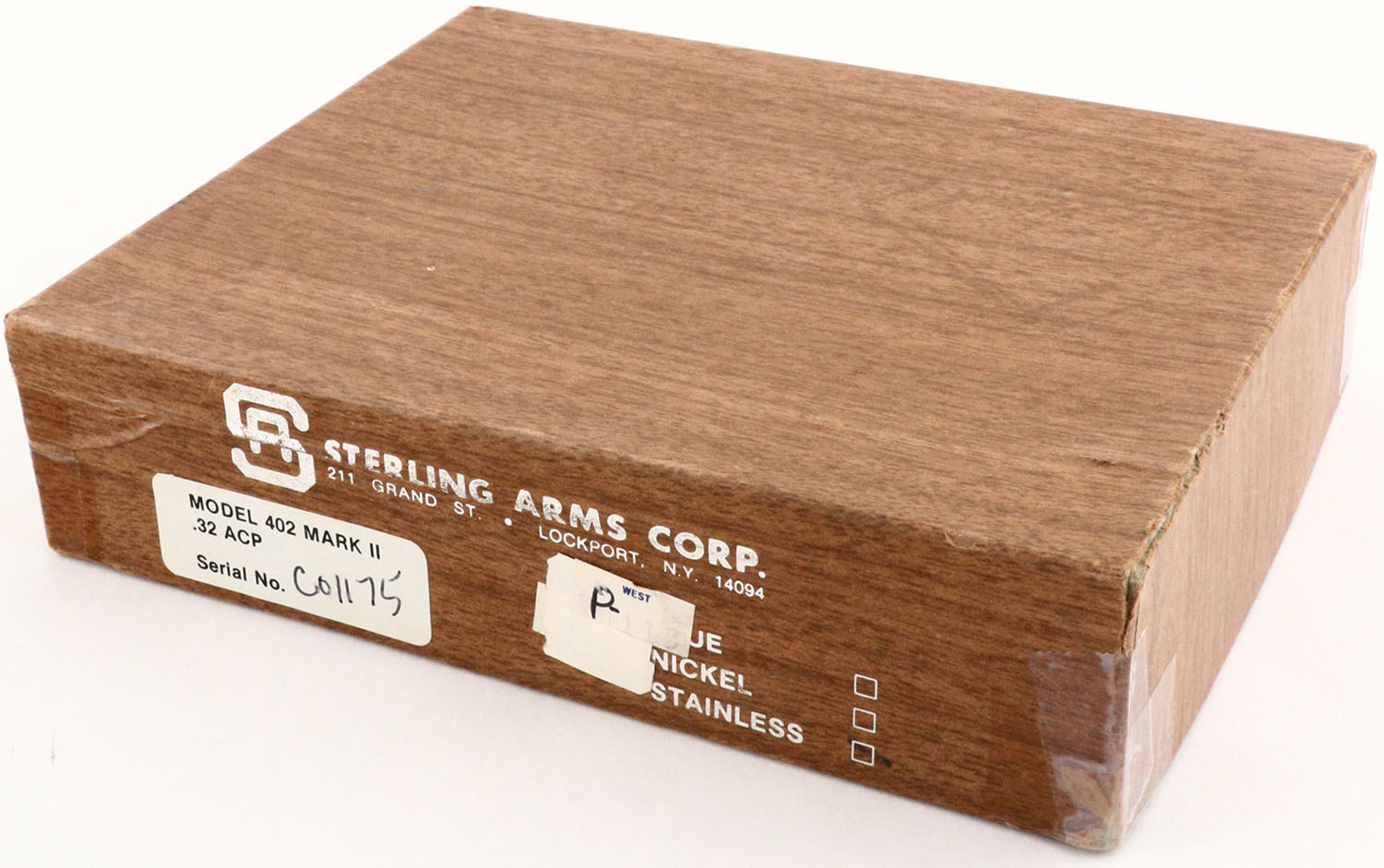 BOXED, Sterling Arms, Model 402 Mark II Stainless, CAL: 32 ACP, MFG: 1974, SN: CO1175, Semi Auto Pistol, 3 1/2'' barrel. The checkered wood grips are excellent. The stainless steel finish is excellent overall. There are a couple minor spots of cleaned rust spotting. Bore is excellent. Adjustable rear sight & integral serrated blade front sight. Comes in factory SN matching box, with related paperwork. Box condition is very good, with tape repairs. FFL Req. - Value: 150 to 300