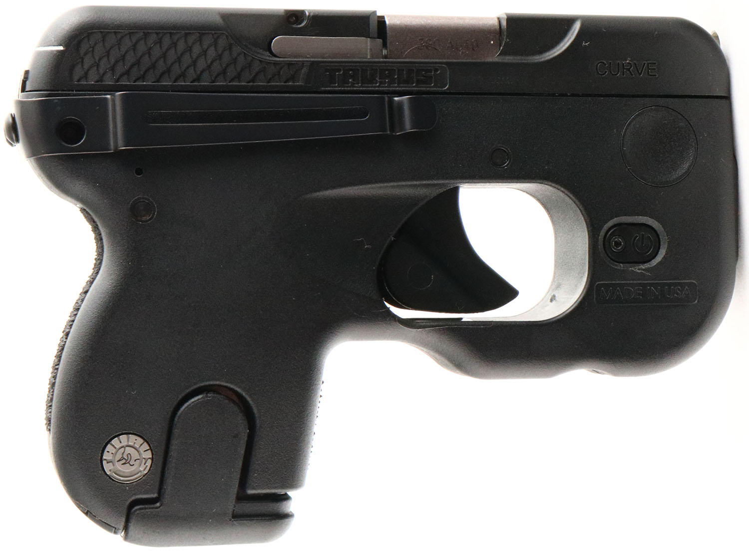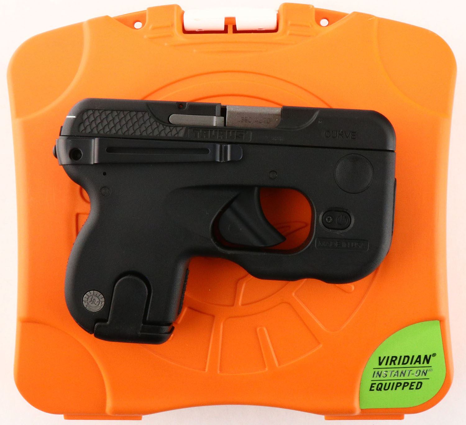 CASED, Taurus, Curve, CAL: 380, MFG: Modern, SN: 1D118709, Semi Auto Pistol, 2 3/4'' barrel. The Viridian/Taurus textured polymer grip frame is mint. The matte black finish on the slide is excellent. Bore is mint. Contrast lines on back of slide, no sights. Integral light & red laser. Belt clip attached. Comes in factory hard case, with related paperwork, tools/battery for laser grip, extra mag, lanyard loop/trigger cover & firearm tools. FFL Req. - Value: 250 to 400