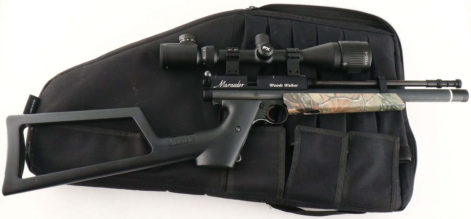 Benjamin Marauder Woods Walker Air Gun (Model BP2220, CAL: 22 (5.5mm), Crosman Custom Stock (Model 1399), FX 3-12x44 scope. Max Fill Pressure 3K PSI. Gauge @ 2500 PSI. Scope missing cap for illumination battery. No barrel shroud. No Magazine. Grade: Very Good - Value: 200 to 400