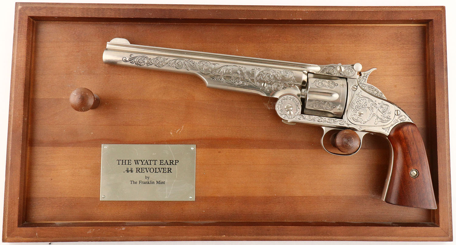 The Wyatt Earp Revolver by Franklin Mint. Replica Display of a S&W No. 3 Schofield. Nickeled Revolver on wood display rack, with silver plaque. Grade: Excellent - Value: 200 to 500