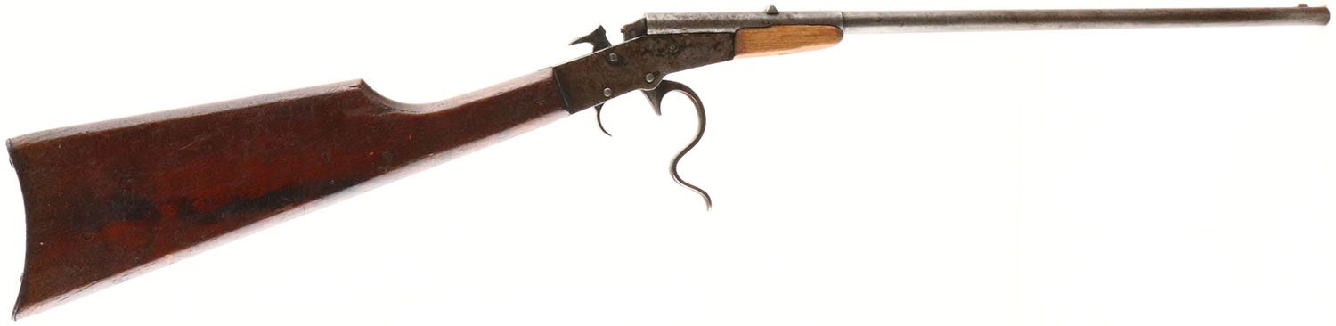 PARTS RIFLE, Western Arms Co., Model Killdeer, .22 Short, MFG: 1915, SN: None, Falling block rifle, 18'' barrel. The straight wood grip stock is good & solid, with scratches, scrapes & dings. The forend is a homemade replacement. The metal blue finish is worn to gun metal gray, with spotty brown patina. Bore is good, with roughness amongst worn rifling. Front blade sight & fixed V-notch rear sight. Original smooth metal buttplate. The breech block does not open & rifle will need repair. Sold ''AS-IS'', with no returns. FFL or C&R Req. - Value: 20 to 100