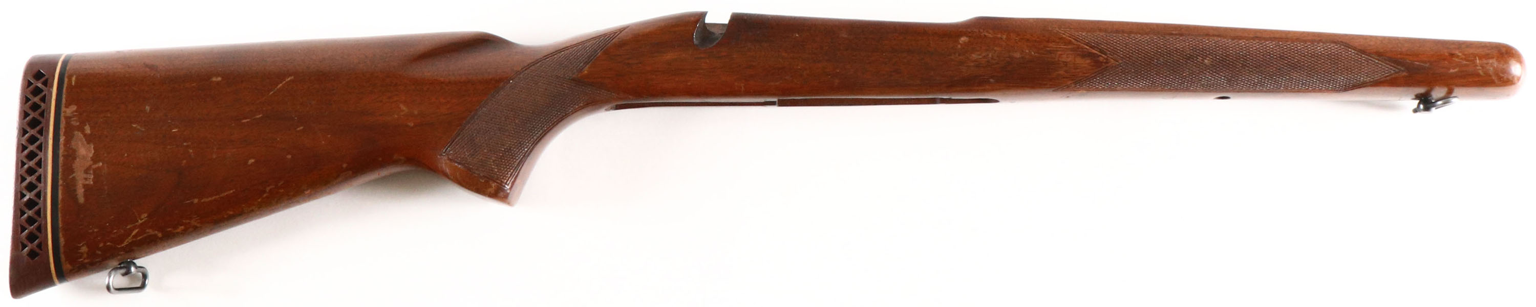 Wood rifle stock, semi-pistol grip, checkered wrist & forend, has rubber recoil pad. Grade: Very Good ++ - Value: 10 to 100