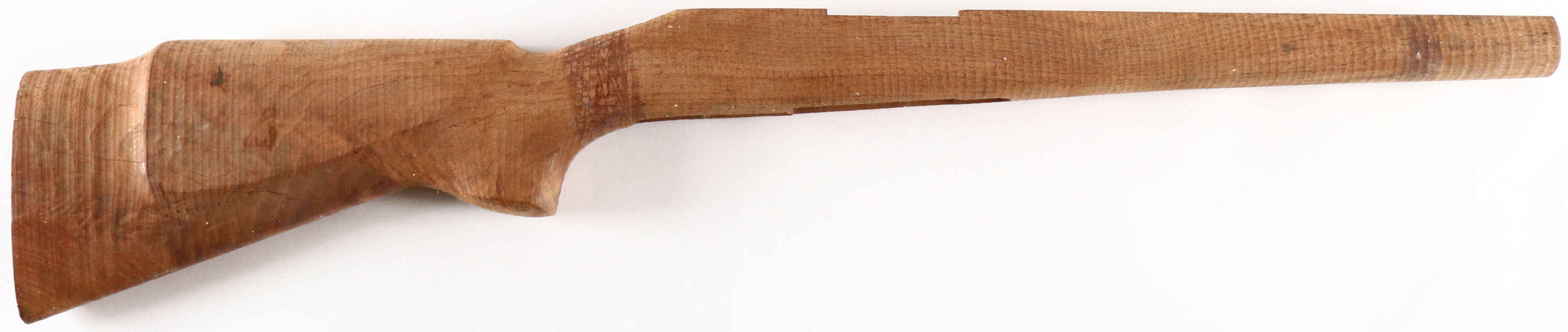 Unfinished wood rifle stock, marked Mauser 98, semi pistol grip, cheeked, no buttplate. Grade: Excellent - Value: 10 to 100
