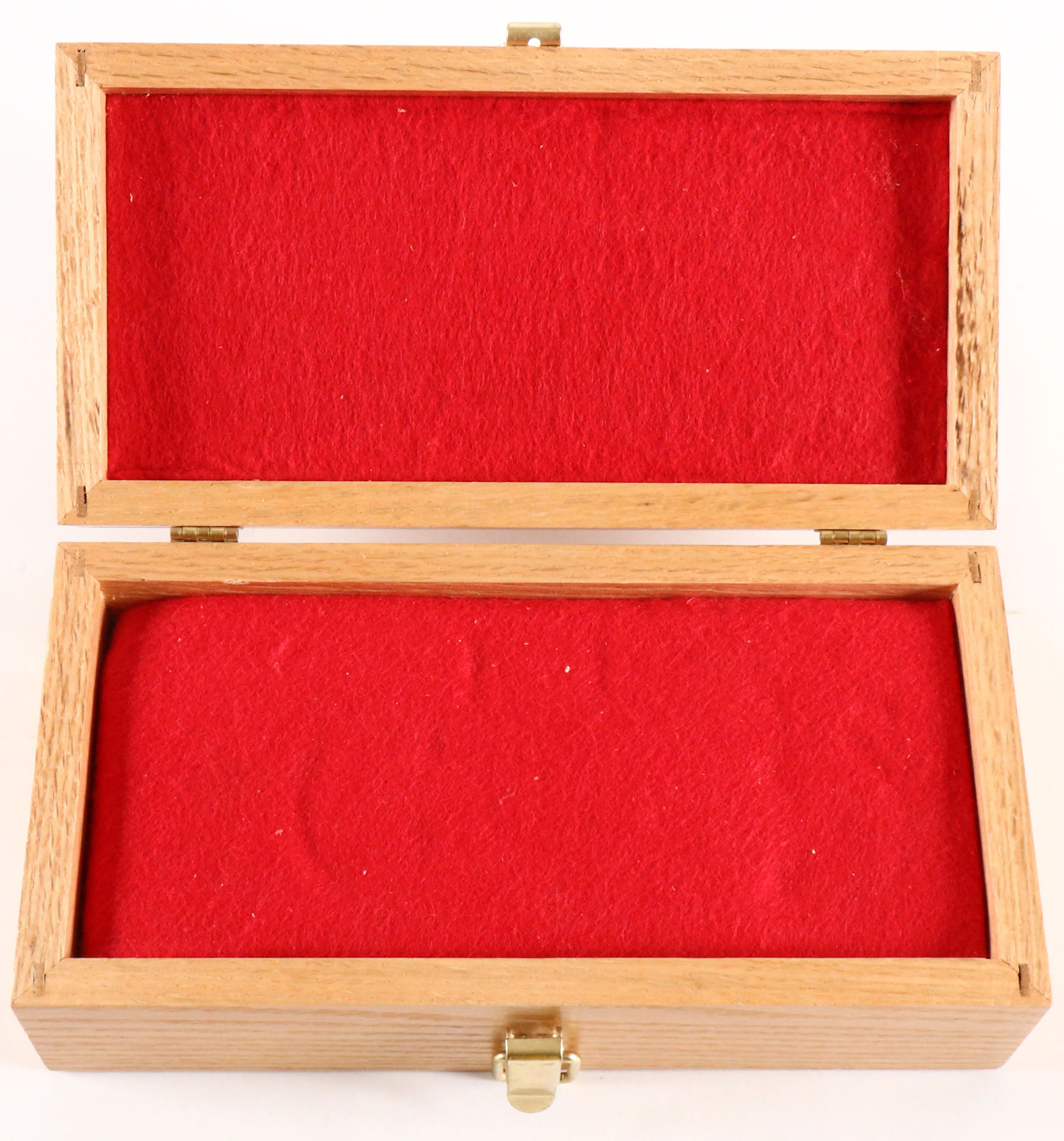 Small wood handgun display case, brass hardware, red felt interior, OD: 10 1/2'' x 5 1/2'' x 4''. Grade: Very Good - Value: 6 to 60