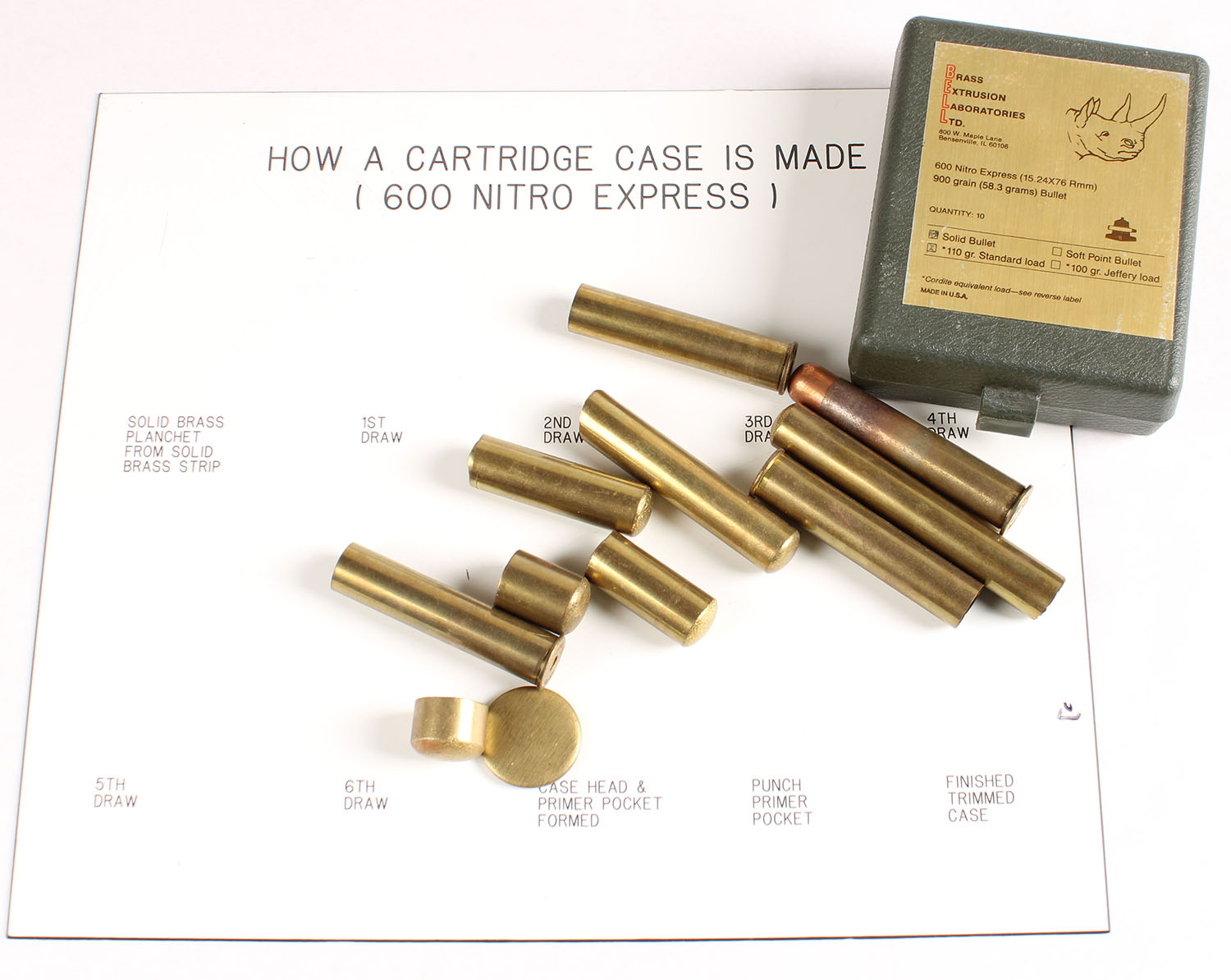 600 Nitro Express cartridge & draw set, HS: B.E.L.L. 19 86 600N.E., also has a plaque on the steps to make from a draw set. Grade: Excellent - Value: 40 to 200