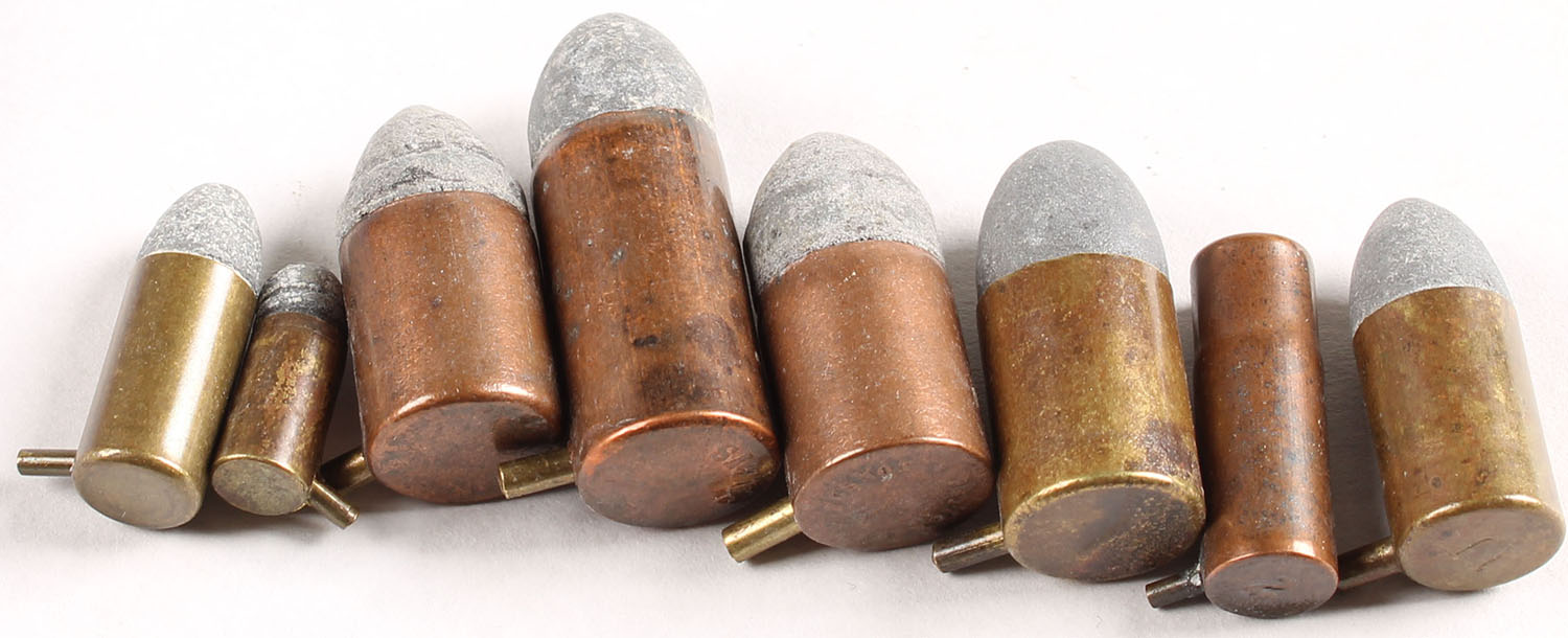 Lot of 8 Pinfires. (4) 12mm Pinfires. 3 short cases, 2 copper cases and one brass (headstamp in indistinct but probably Charles Fusnot) and 1 long case by HB of Paris. (1) 9mm Pinfire, NHS. (2) 7mm Pinfire, 1 Ball and 1 Shot (HS=''7''). (1) 5mm Pinfire, NHS. Grade: Excellent - Value: 30 to 50