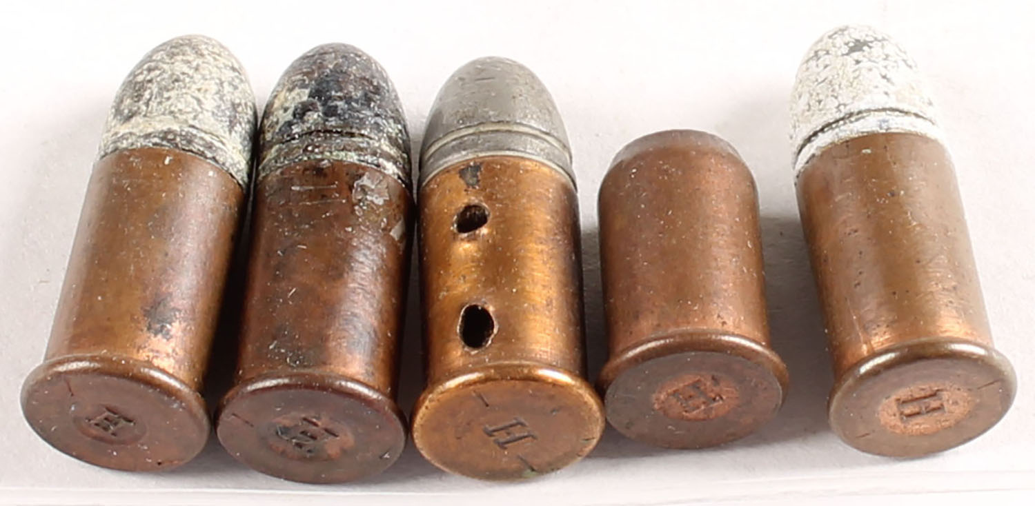 Lot of 5. 30 Short Rimfire. HS:''H raised''. 4 ball and one blank round. Grade: Excellent - Value: 20 to 40