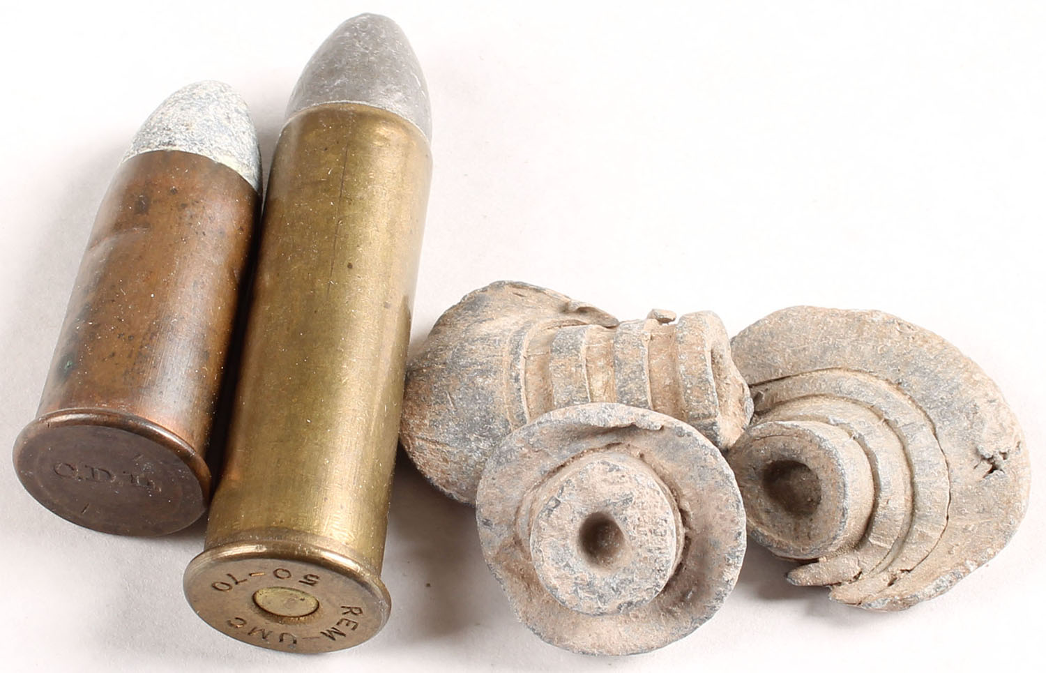 Lot of 2. (1) 56-50 Spencer Rimfire. HS:''CDL'' impressed. PT Lead. (1) 50-70 Govt.. HS:''REM-UMC 50-70'', PT Lead. Also included are three civil war era dugout bullets. - Value: 30 to 60