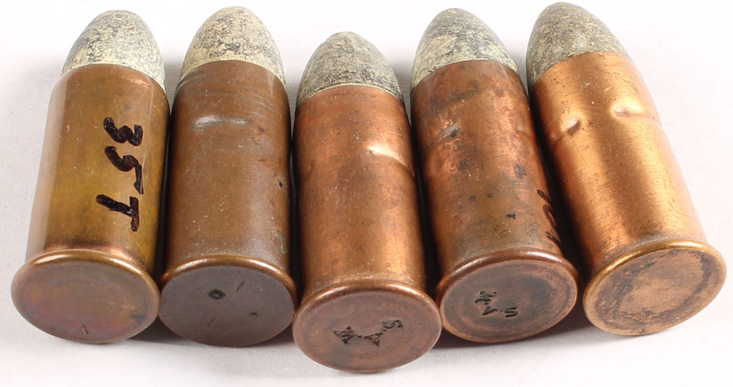 Lot of 5. 56-52 Spencer Rimfire. (3) HS:''SAW'' impressed.. (3) NHS---one has 3 tick marks and another has no bullet crimps on case. All Semi Point Lead. - Value: 50 to 100
