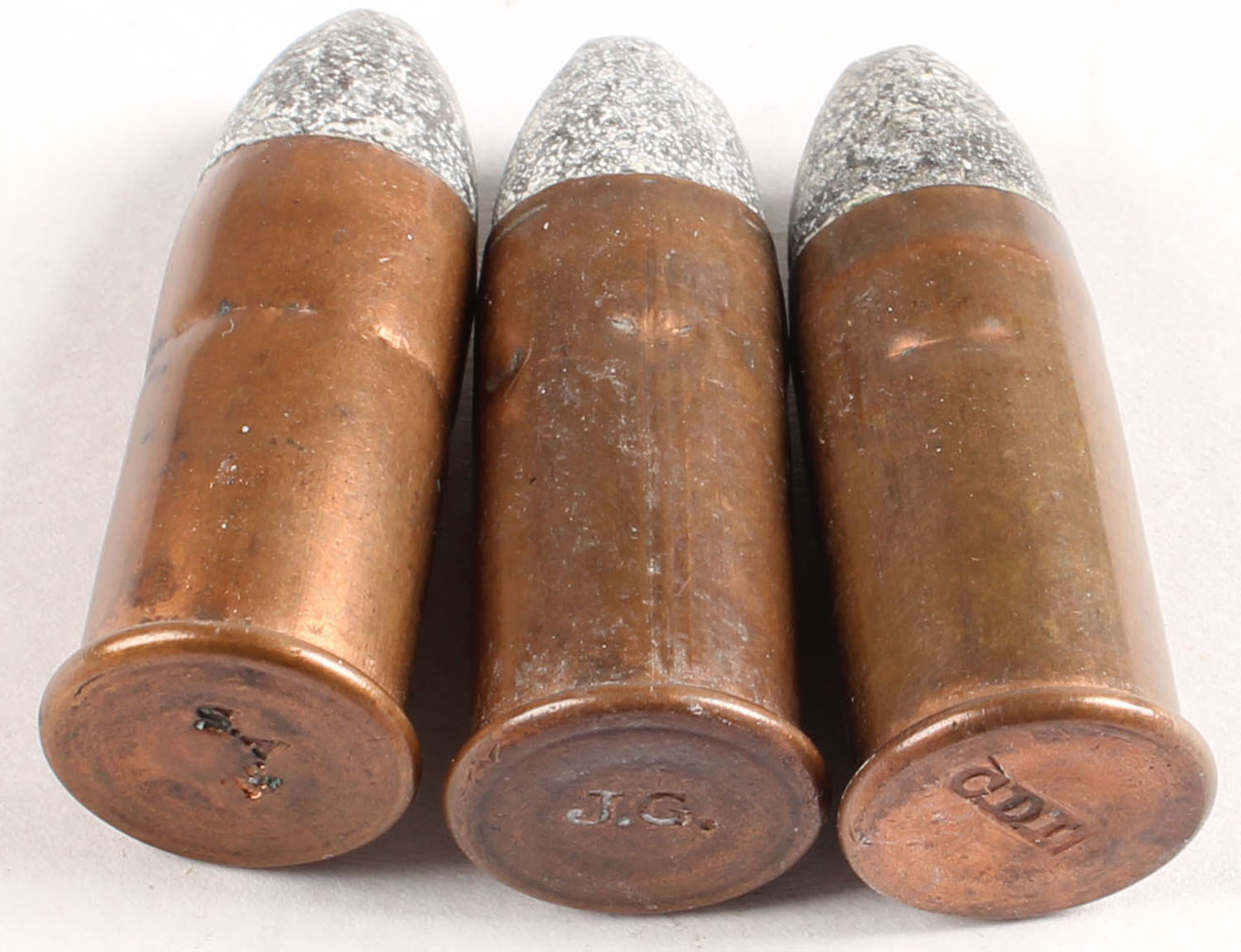Lot of 3. 56-50 Spencer Rimfires. (1) HS:''SAW'' impressed. (1) HS:''CDL'' impressed. (1)HS:''J.G.''. All PT Lead. Grade: Excellent - Value: 20 to 50