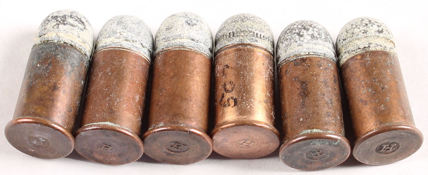 Lot of 6. 41 Long Rimfire (.63'' case). HS:''H'' raised in a circle. RN Lead. Grade: Excellent - Value: 30 to 60