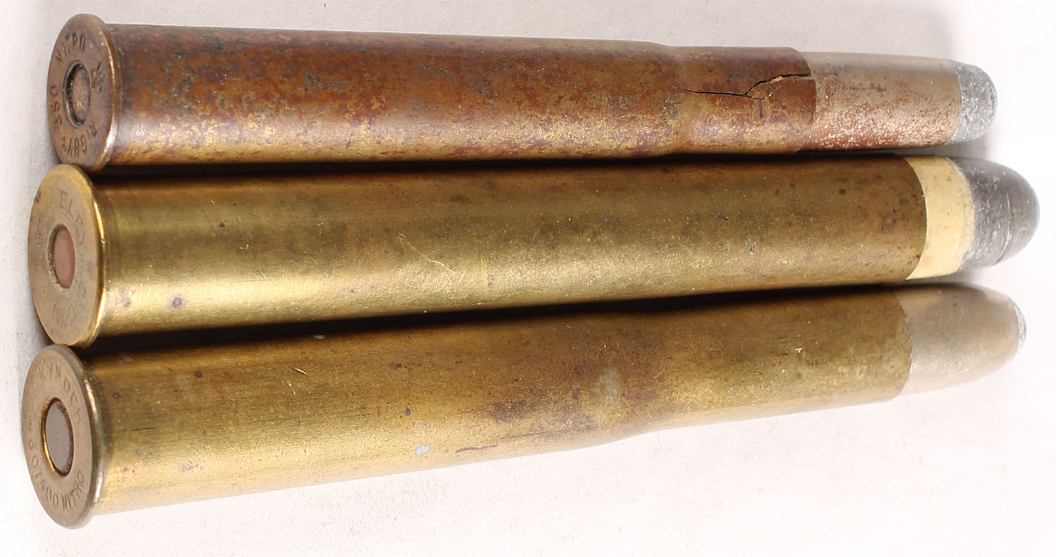 Lot of 3. (1) .450x3.25'' Express. HS:''ELEY.LONDON .450'', RN PP Lead w/ hollowpoint. (1) .450/400 Nitro, HS:''KYNOCH 450/400 NITRO'', RN CN SP. (1) .350 Rigby ''Special'', HS:''RIGBY'S .350 NITRO GR'', RN CN SP, Very early loading by George Roth for Rigby. - Value: 30 to 60
