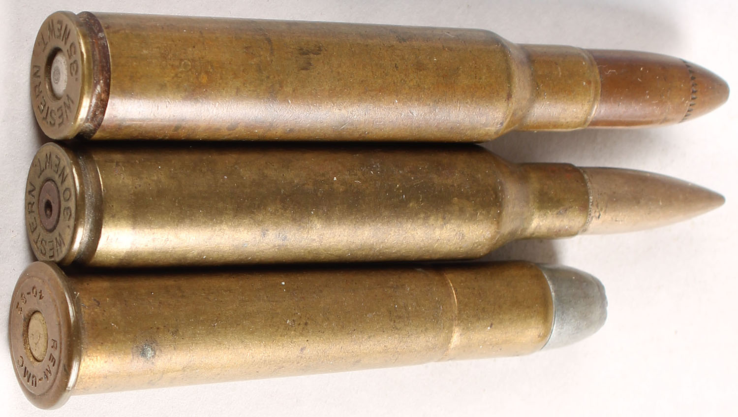 Lot of 3. (1) 40-82 WCF, HS:''REM-UMC 40-82'' FN Tin over copper, SP. (1) 35 Newton, HS:''WESTERN 35 NEWT.'', HP CJ SP. (1) 30 Newton, HS:''WESTERN 30 NEWT., PT CN FMJ. - Value: 20 to 30