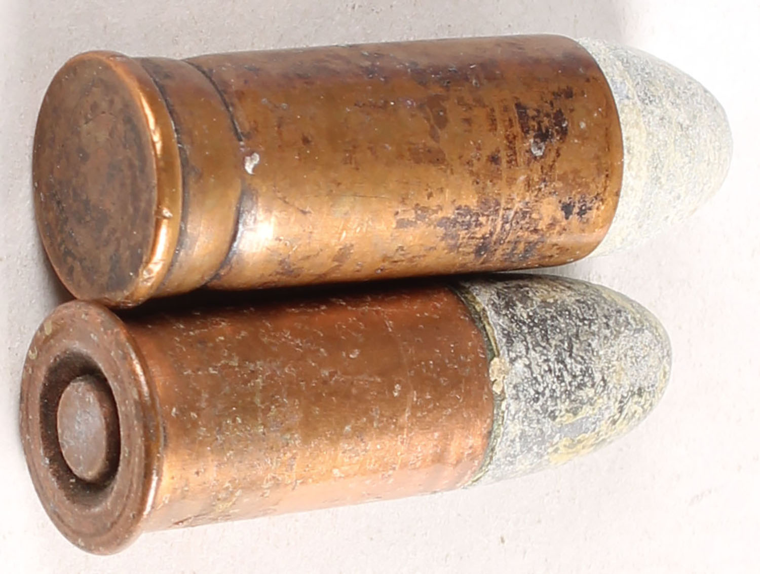 Lot of 2 Indian War era military revolver cartridges. (1) 44 S&W Martin Prime. NHS. Semi-PT, Lead. 45 Colt CL=1.10. NHS, Benet Primed. FN Lead. - Value: 20 to 40