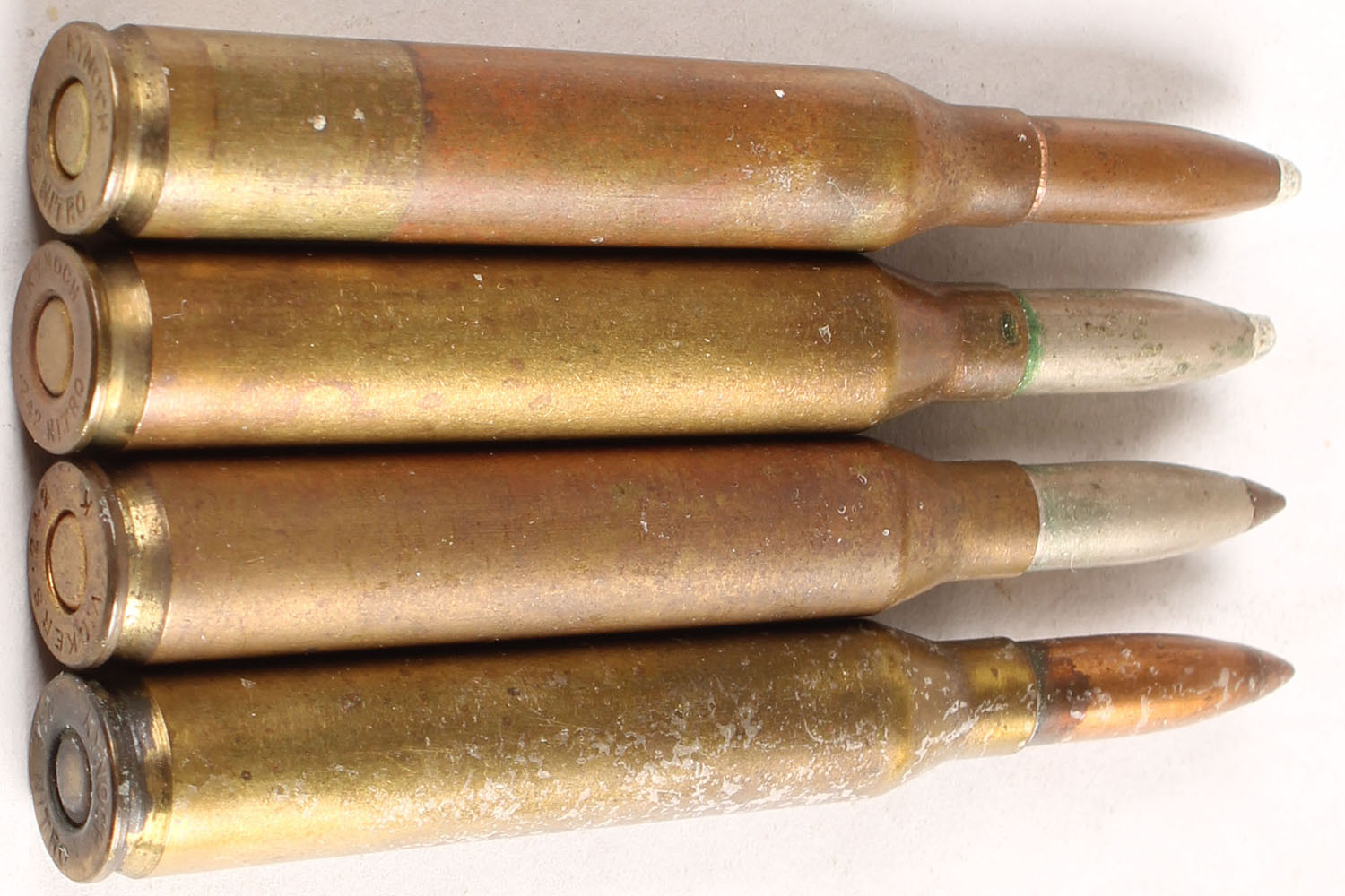 Lot of 4 .242 Nitro. (3)KYNOCH 242 NITRO''. Different bullet loadings--See Photo. (1) HS:''VICKERS. 242 K'', PT CN copper tip. - Value: 30 to 60