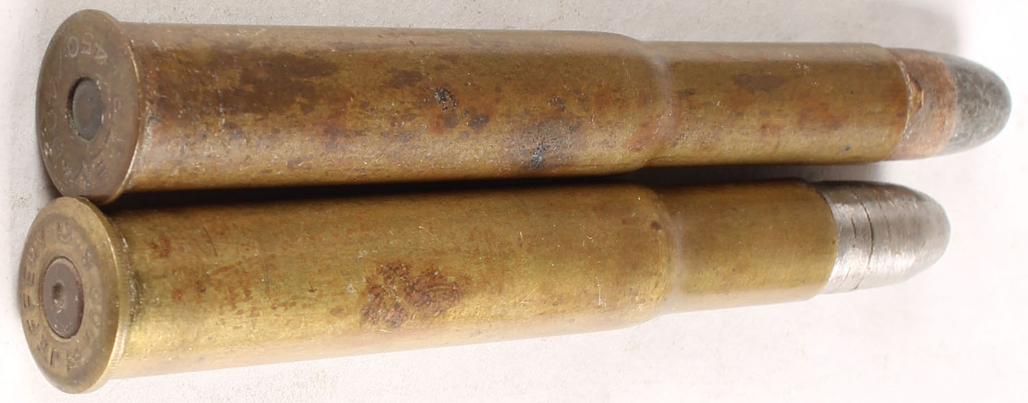 Lot of 2, British Sporting Cartridges. (1) 450-400 x 3.25'' Express, HS:''ELEY . 450-400 .'', RN PP Lead w/ copper tube. (1) 400 x 3'' Jeffery's, HS:''JEFFERY C 400 S K'', FN HP w/ a bright tinnish jacket, and snapped primer - Value: 20 to 30