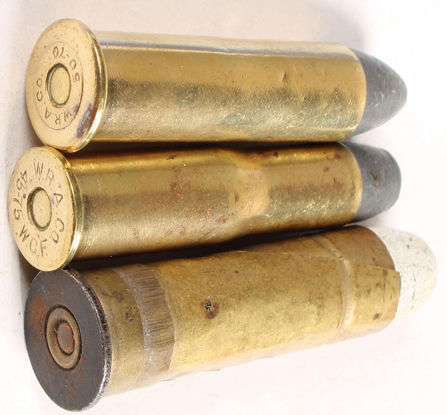 Lot of 3. (1) 45-75 WCF. HS:''WRA Co. 45-75 W.C.F.'', FN Lead. (1) 50-70 Govt., HS:''WRA Co. 50-70'', PT Lead. (1) .577 Snider, NHS. Coiled Case, Canadian Pattern. RN Lead. - Value: 20 to 40