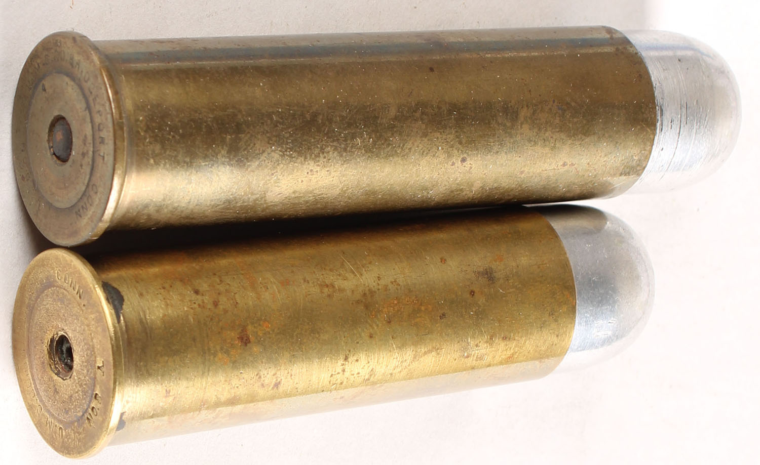Lot of 2. Dummies. (1) 8 gauge x 3.25''. HS:''U.M.C. Co. BRIDGEPORT CONN No 8'', Loaded with aluminum projectile, no primer. (1) 8 gauge x 2.75''. HS:''U.M.C. Co. BRIDGEPORT CONN No 8'', Loaded with aluminum projectile, no primer. - Value: 20 to 40