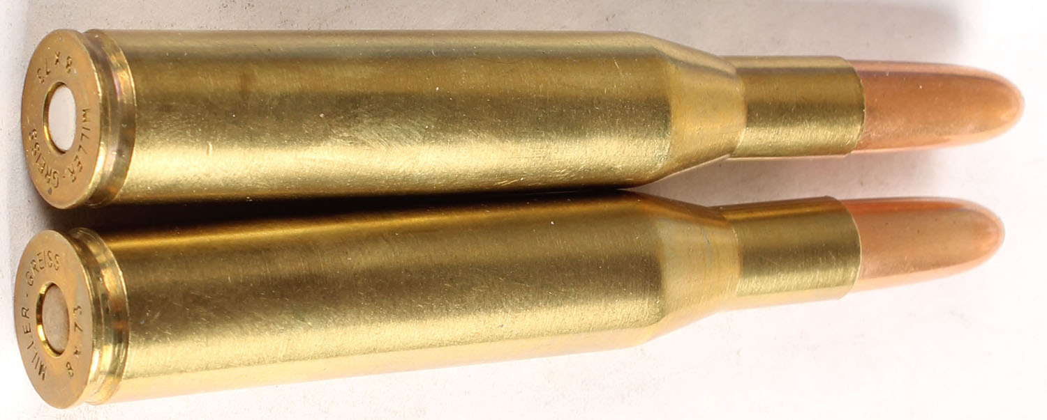 Lot of 2. 8x73 Miller Greiss. HS:''MILLER GREISS 8x73''. RN CJ SP. One has a nickel primer and the other a brass one. Probable more recent manufacture. - Value: 20 to 40