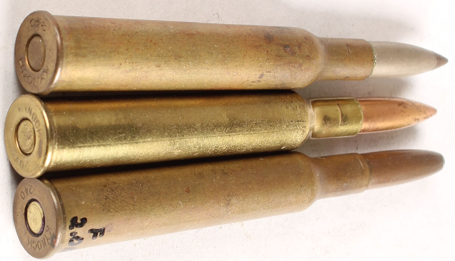 Lot of 3. .240 Flanged Magnum, HS:''KYNOCH .240''. Different bullet loadings, See Photo. - Value: 2 to 40