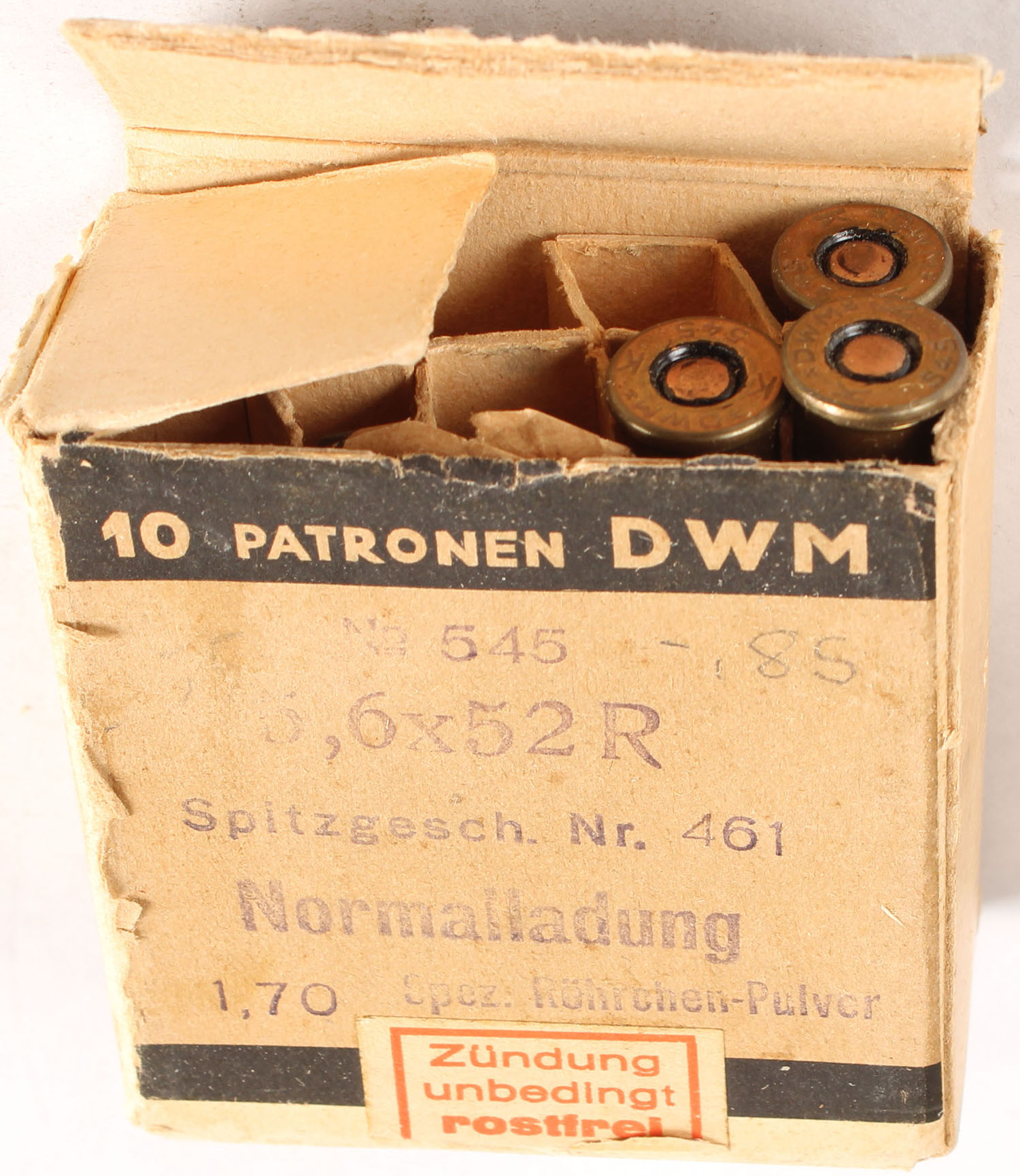 10 Rd. box (3 rounds present) by DWM, Caliber: 5.6x52R (DWM #545). Box has Swiss Stamp and is stamped 912 SV on bottom. Small letter ''k'' on headstamp=1936. - Value: 20 to 40