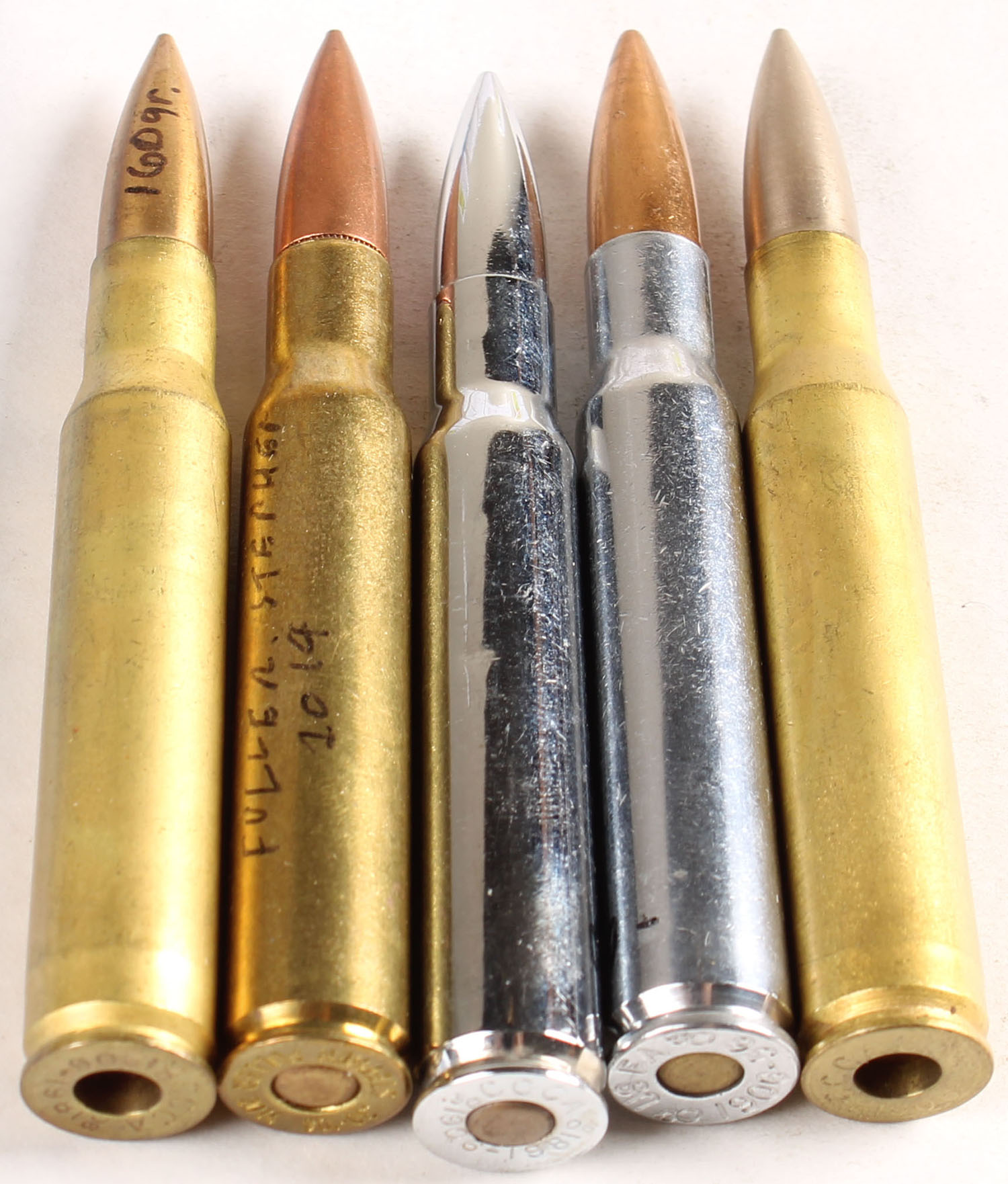 Lot of 5. 30-06 Springfield. All Commemoratives. (2)HS:''CCCA 06 1906-1981 30'', both brass cases w/ one CJ and one CN. (1)HS:''.30 '06 2014 STEPHEN FULLER'', PT CJ FMJ. (1) HS:''. HS:''US FA bomb 1906-56 bomb'', PT CJ FMJ. (1) HS:''CCCA 06 1906-1981 30'', Chrome case and bullet. - Value: 20 to 40