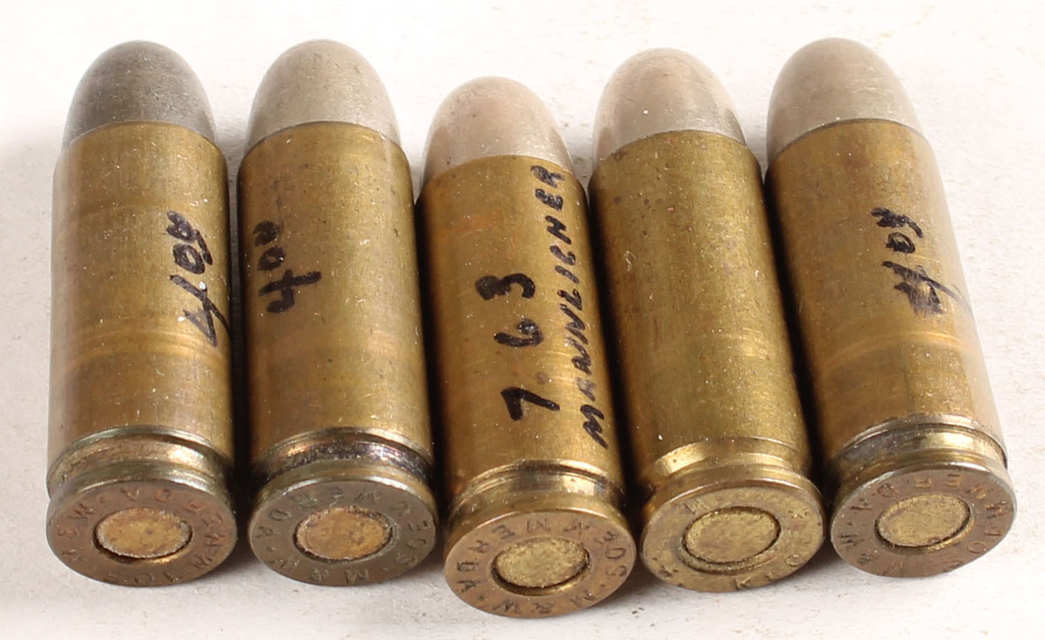 Lot of 5 7.63 Mannlicher Auto Pistol, Mdl 1901. (4) HS:''M&W . SOMMERDA .'', RN CN FMJ. (1) HS:''H * K&C *'', RN CN FMJ - Value: 20 to 30