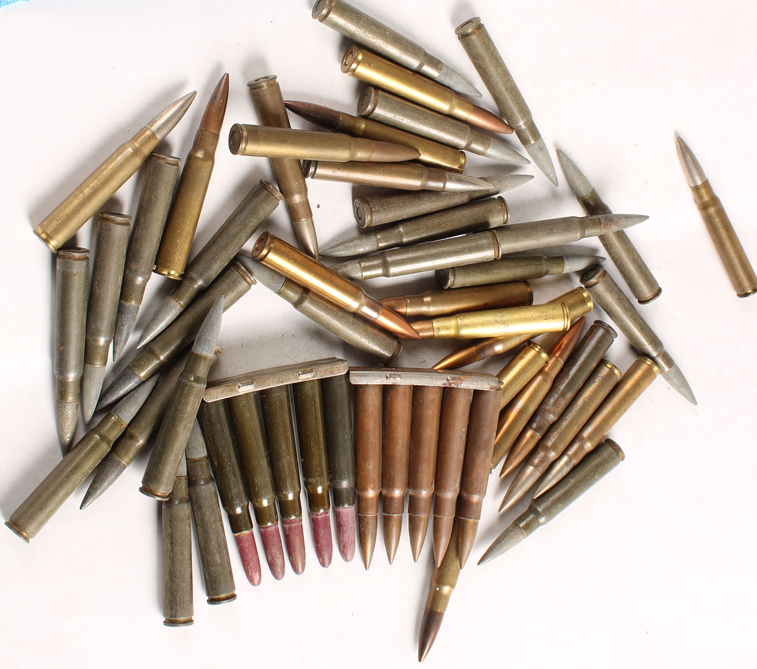 Lot of 54. 7.9x57 Mauser. A mix of countries and headstamps. All Ball loads except for five WW II German blanks. Grade: Very Good + - Value: 20 to 60
