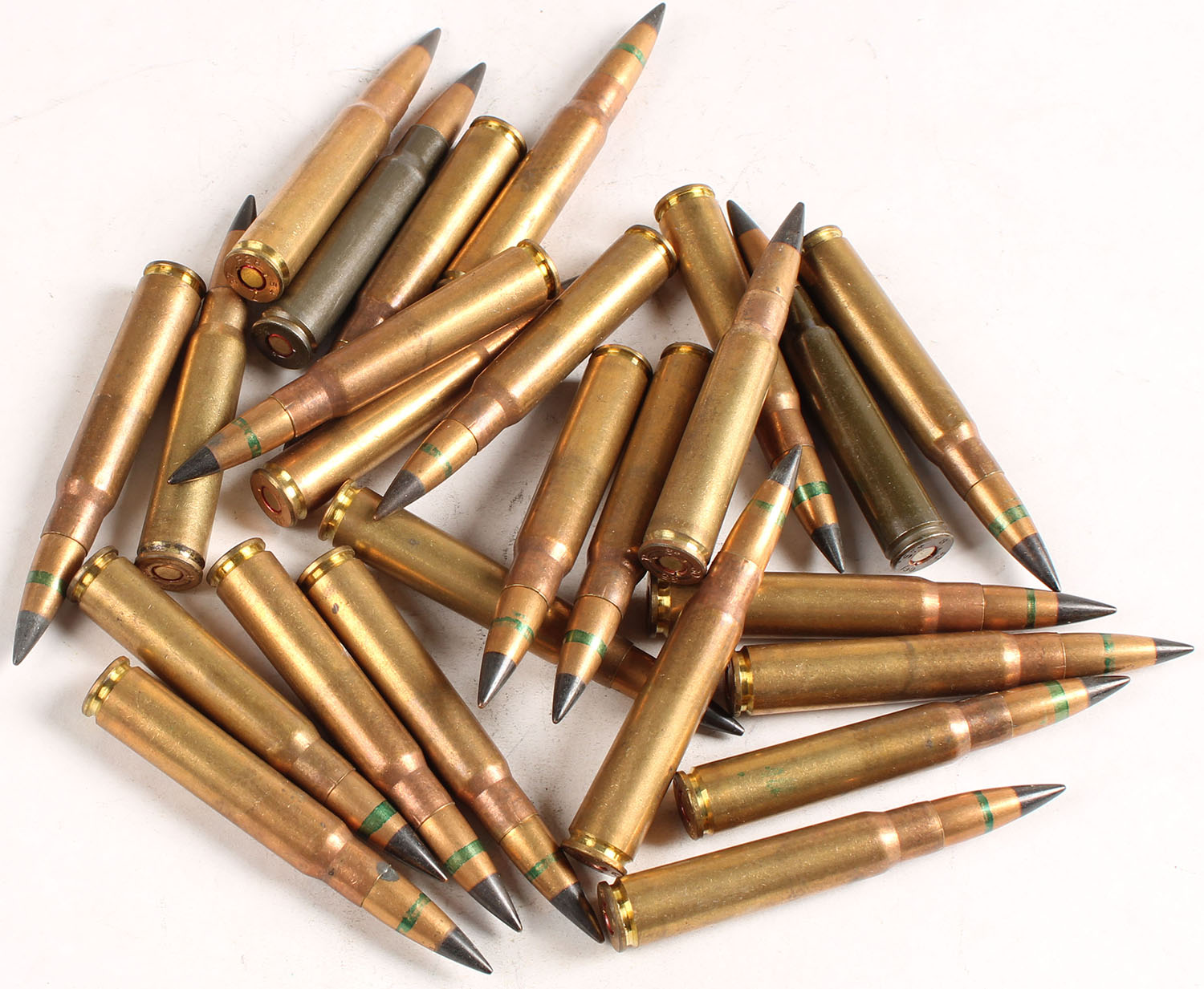 Lot of 25. 7.9x57 Mauser. (18) SmK-Lspur-V (most are--HS:''dnf S* 6 42'', PT CJ FMJ with black tip and green ring on bullet. (7) SmK-Lspur, Various headstamps five are brass case and two steel. Grade: Excellent - Value: 20 to 40