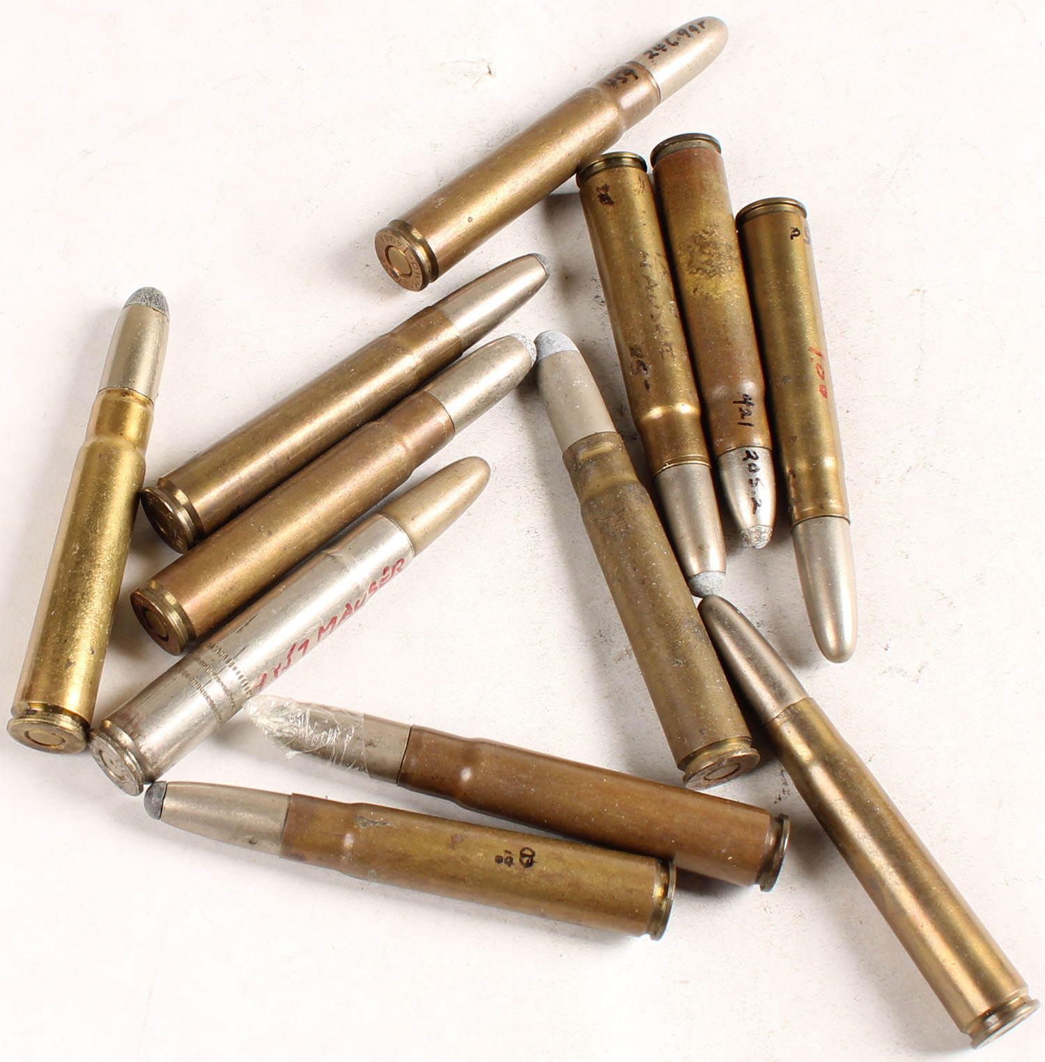 Lot of 12. 9x57 Mauser (DWM 491A). All by DWM. Various headstamps and bullet loadings. Grade: Very Good + - Value: 20 to 60