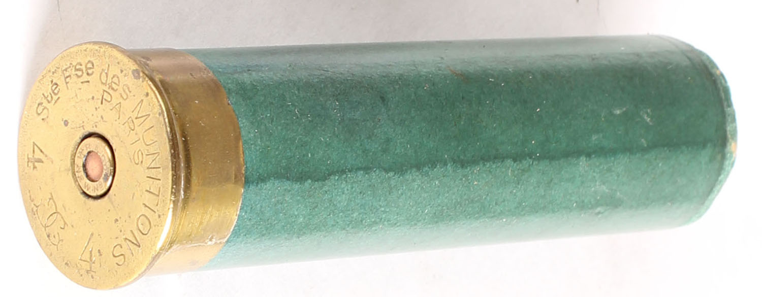 Ste Fse des Munitions Paris No 4, empty, 4 ga. Green paper, 4'' OAL, solid shell. Grade: Excellent - Value: 20 to 60