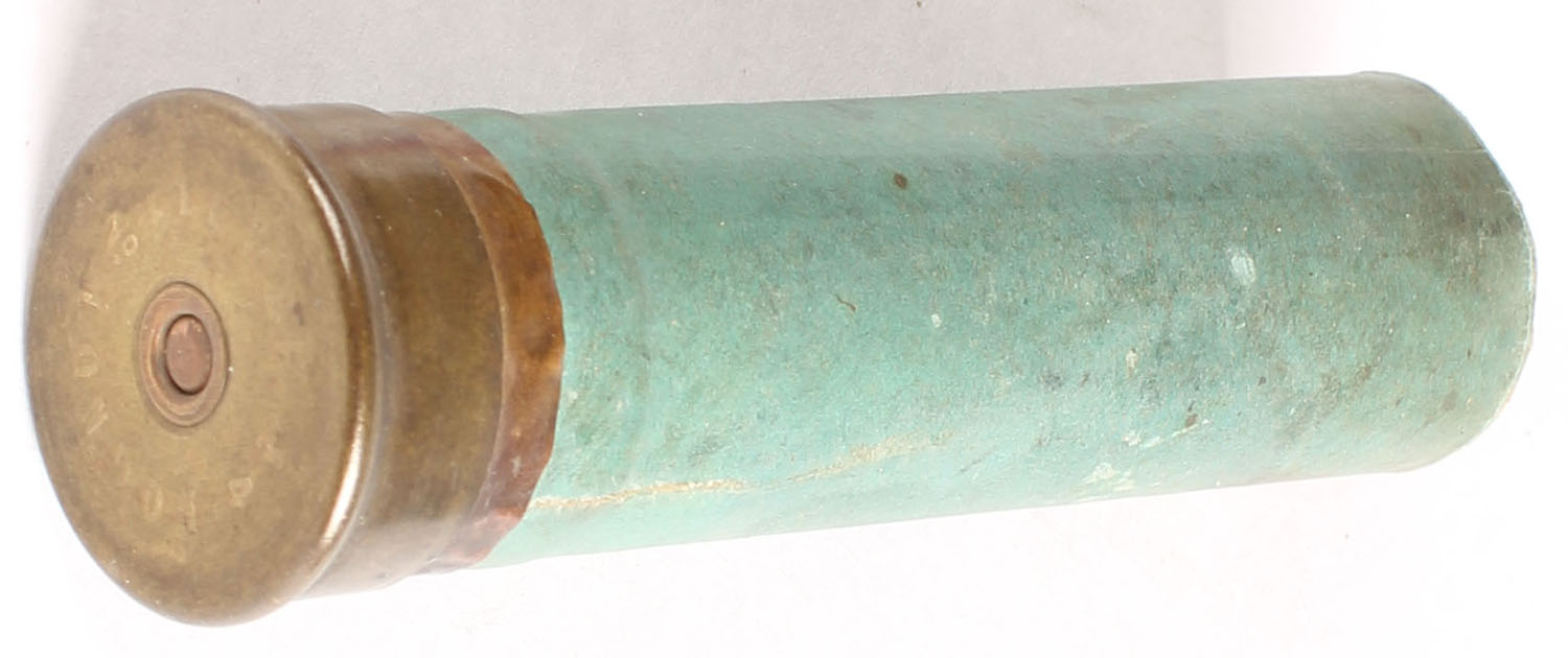 Eley London No. 4, Empty green paper Shot shell, 4'' OAL, 4 Ga., shell shows some wear. Grade: Very Good ++ - Value: 20 to 60