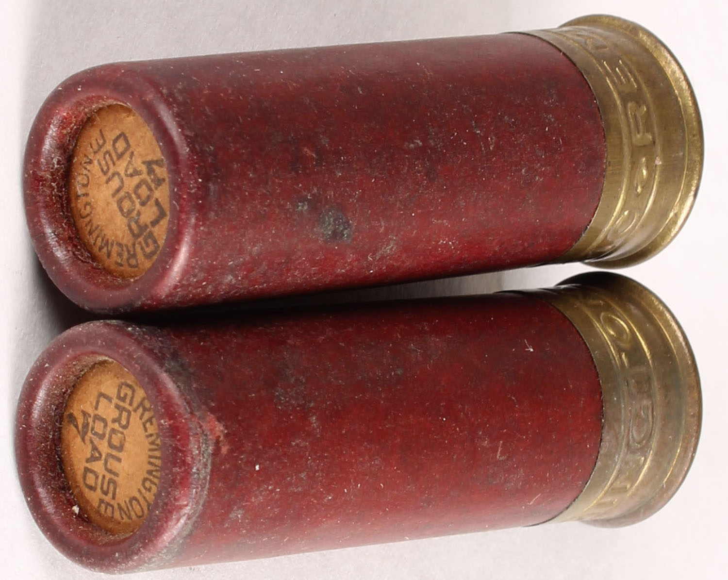 Lot of 2, TW= ''Remington GROUSE LOAD 7c'', H/S= ''REM-UMC NITRO CLUB'', 12ga, 2 3/8'' OAL, red paper case. Grade: Very Good ++ - Value: 10 to 50