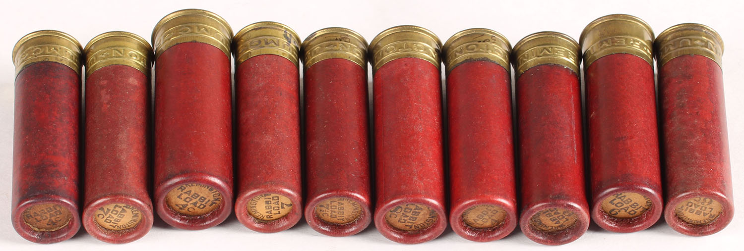 Lot of 10, TW= RABBIT LOAD, H/S= ''REM-UMC NITRO CLUB'', mixed gauges, loaded red paper case. Grade: Excellent - Value: 10 to 50