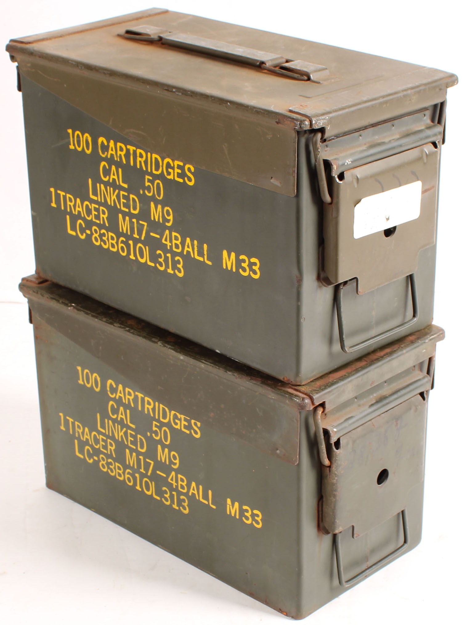 | Lot of two M2A1 .50 cal metal ammo cans, insides of both cans ha...