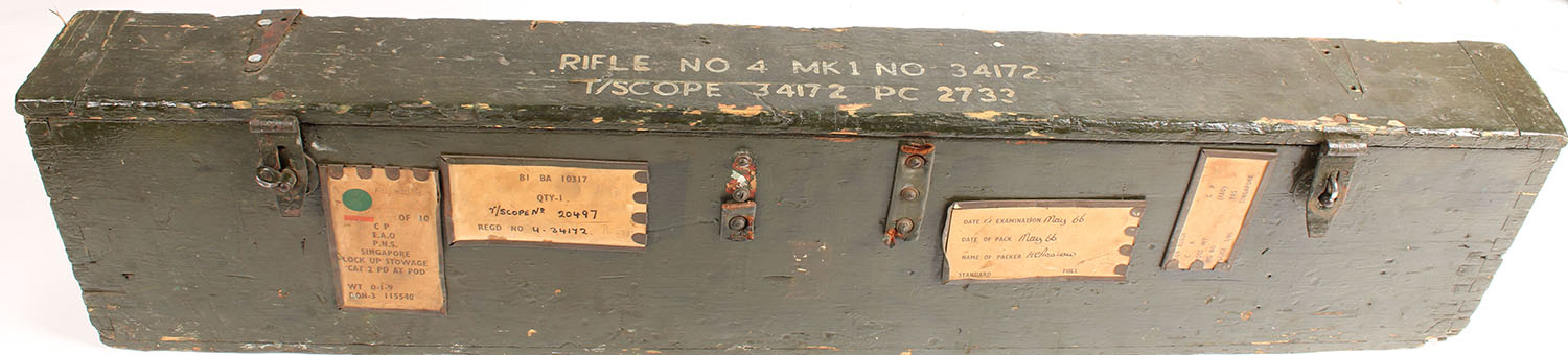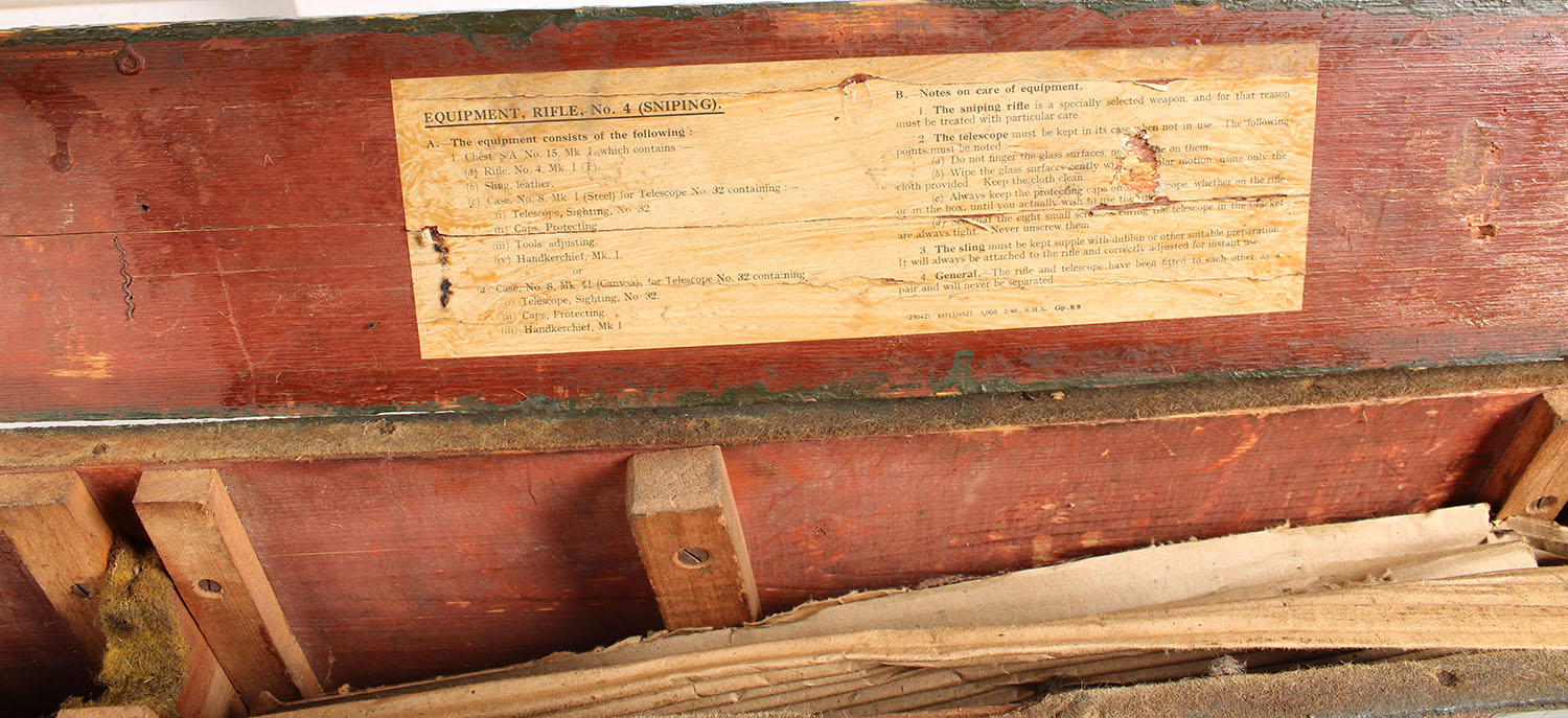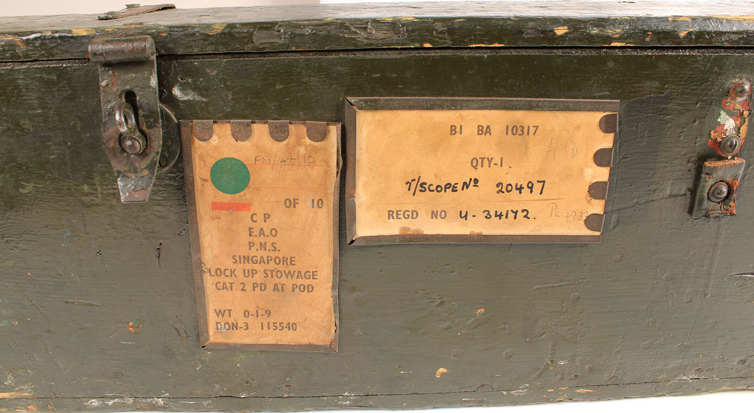 British, Chest S.A. NO. 15. MK. 1., Transit chest for a No.4 Mk.1 (T), perfect accessory for the No.4 MK.1 (T) we have in this auction, box has small scratches, chips, dings, & wear from use/age, the leather strap on the back is torn, metal parts of chest have light wear & light rust on them, has some replaced hardware & is missing a hinge, inside parts seam to be fully intact, card on front dates box to may 1966, see photos for close up of the info cards on the front. Grade: Very Good + - Value: 400 to 800