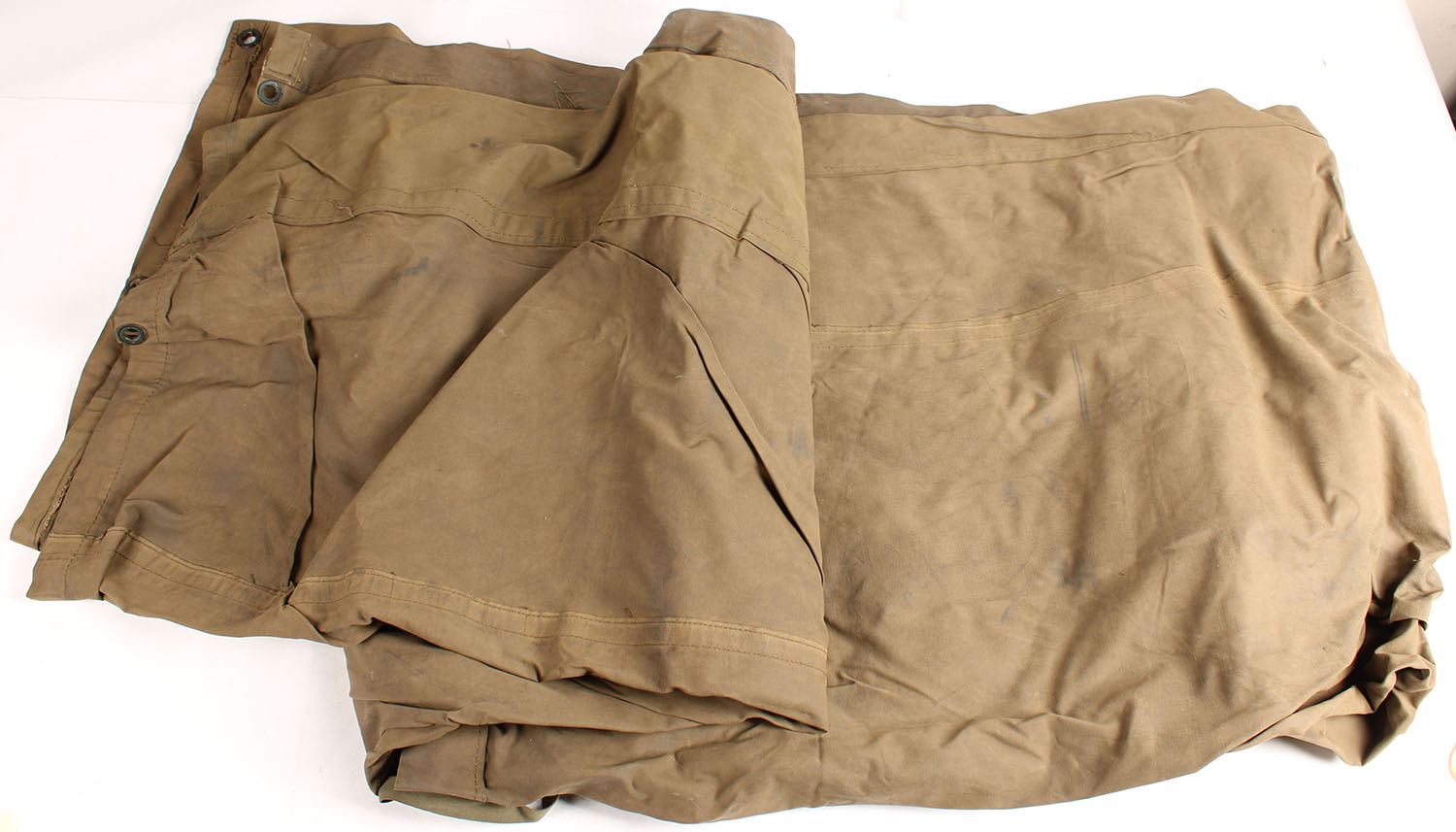 Large Military tarp, heavy canvas, has stains, holes, & frayed stitches. Grade: Good ++ - Value: 10 to 40
