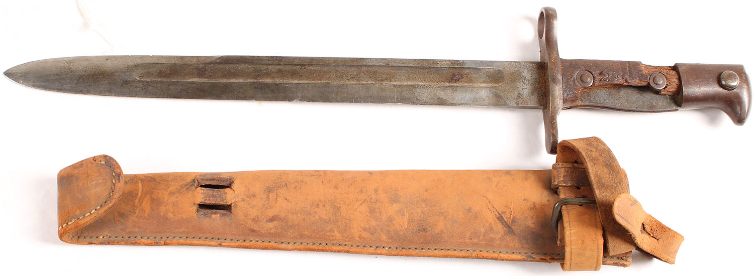 US, M1892 Krag Bayonet, with a M1912 picket pin Scabbard. The blade has a few nicks/chips, & spots of patina. The guard & pommel have toned to a brown patina, the left grip has a large chunk missing. The left side of the blade is marked ''1902'', the right side of the blade is marked ''US''. The scabbard has wear, scuffs, & the leather is cracking in spots due to age, but is still in very good condition. The M1892 bayonet was based of the Swiss M1889 Bayonet, & production of the bayonet ran from 1894 to 1903. the M1912 picket pin scabbard was not designed for the Krag bayonet & was first made way after production of the Krag bayonet ceased. It was meant for the M1912 picket pin, which meant for the cavalry & was a multi-tool of sorts. It could be driven into the ground to tether the cavalryman's horse, also it has a claw hammer head & could be used to make emergency repairs to saddle, tack, or horseshoes. Grade: Good ++ - Value: 50 to 150