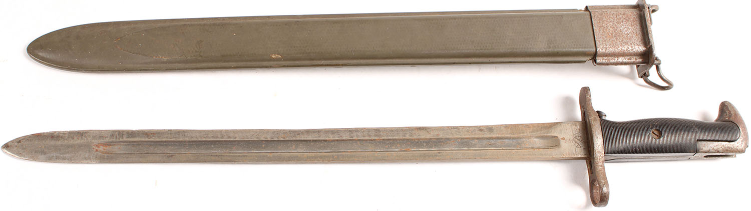US, Utica Cutlery Co., M1905 bayonet with sheath, second production. Blade has some small dings & light rust spotting, the right side of the blade has a faint Springfield crossed cannon logo, the left side of the blade is marked ''U. C.'', flaming bomb, ''U. S.'', ''1942'', sheath has some rust. Grade: Very Good + - Value: 100 to 200