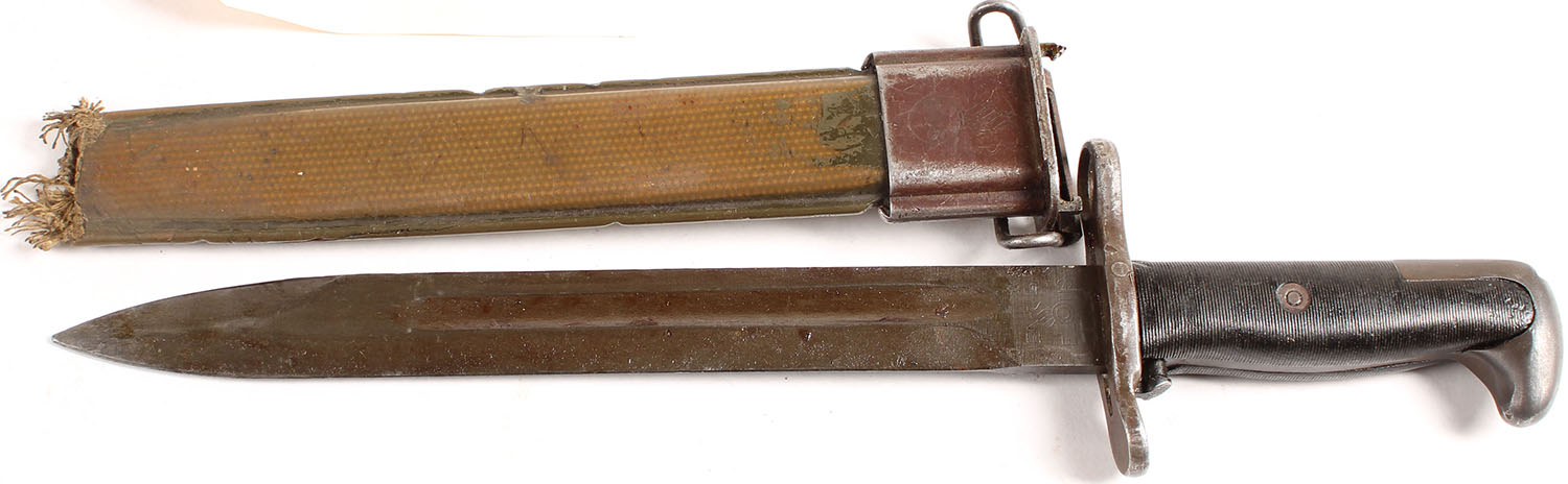 US, Greece contract, M1 bayonet & M7 sheath. The blade has old grease & sheath wear. The left side of the blade is marked ''EN S'', ''E_'' flaming bomb ''US''. The sheath is missing the bottom cap & the metal parts have toned brown. These bayonets are believed to have been made under contract to the US Government & provided to Greece under the Military Assistance Program between 1951 & 1963. they were made to the US government speciation's, & are identical to the WW2 production M1 bayonets, other than the different markings, the sheaths made with the bayonets have the same story. The makers of these bayonets is unknown, but is believed to be European. The ''E'' in the ''E_'' marking stands for the Greek word for bayonet. 19,000 of these bayonets were imported into the country along with M1 Garand rifles returned to the U.S. Government by Greece. Grade: Excellent + - Value: 100 to 250