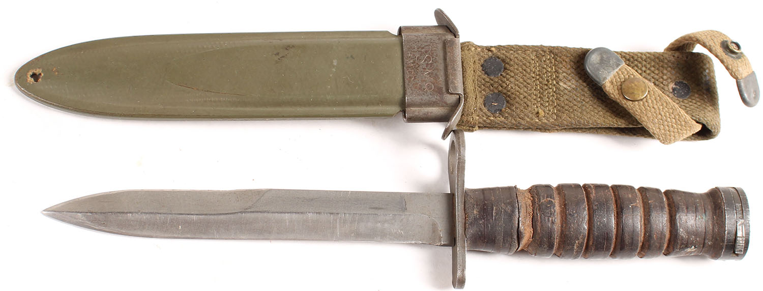 US, Utica Cutlery Co., M4 Bayonet with M8 sheath, leather handle, blade has a few spots of light patina, the top of the guard is marked ''U.S.M4'', ''UTICA''. Grade: Very Good ++ - Value: 100 to 200