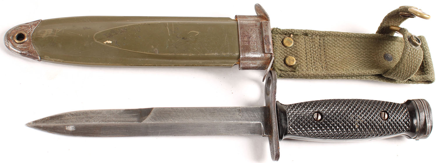 US, Bren-Dan Inc., M4 Bayonet with M8A1 sheath, blade has scratches & sheath wear, the right grip has a small crack forming by the guard, the muzzle ring appears to be slightly bent backward towards the grip, the top of the guard is marked ''U.S. M4'', ''BREN-DAN''. Bren-Dan, Inc. of Stamford, Connecticut was awarded a contract to make M4 bayonets in June 1971. Their M4 production ran 1971-72. These were the last M4 bayonets produced for the U.S. government. Grade: Very Good + - Value: 100 to 200