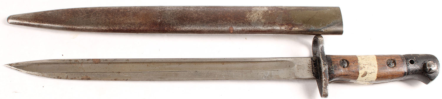 Indian, RFI (Rifle Factory Ishapore), Mk1 Bayonet with sheath, made form shortened M1907 bayonet, blade is worn gray & has a few spots of patina, the right side of the blade is marked ''DP63''. The right side of the blade is marked the Indian three headed lion logo, ''MK1'', ''RFI''. The right side of the guard is marked ''DP''. Grade: Very Good ++ - Value: 50 to 100